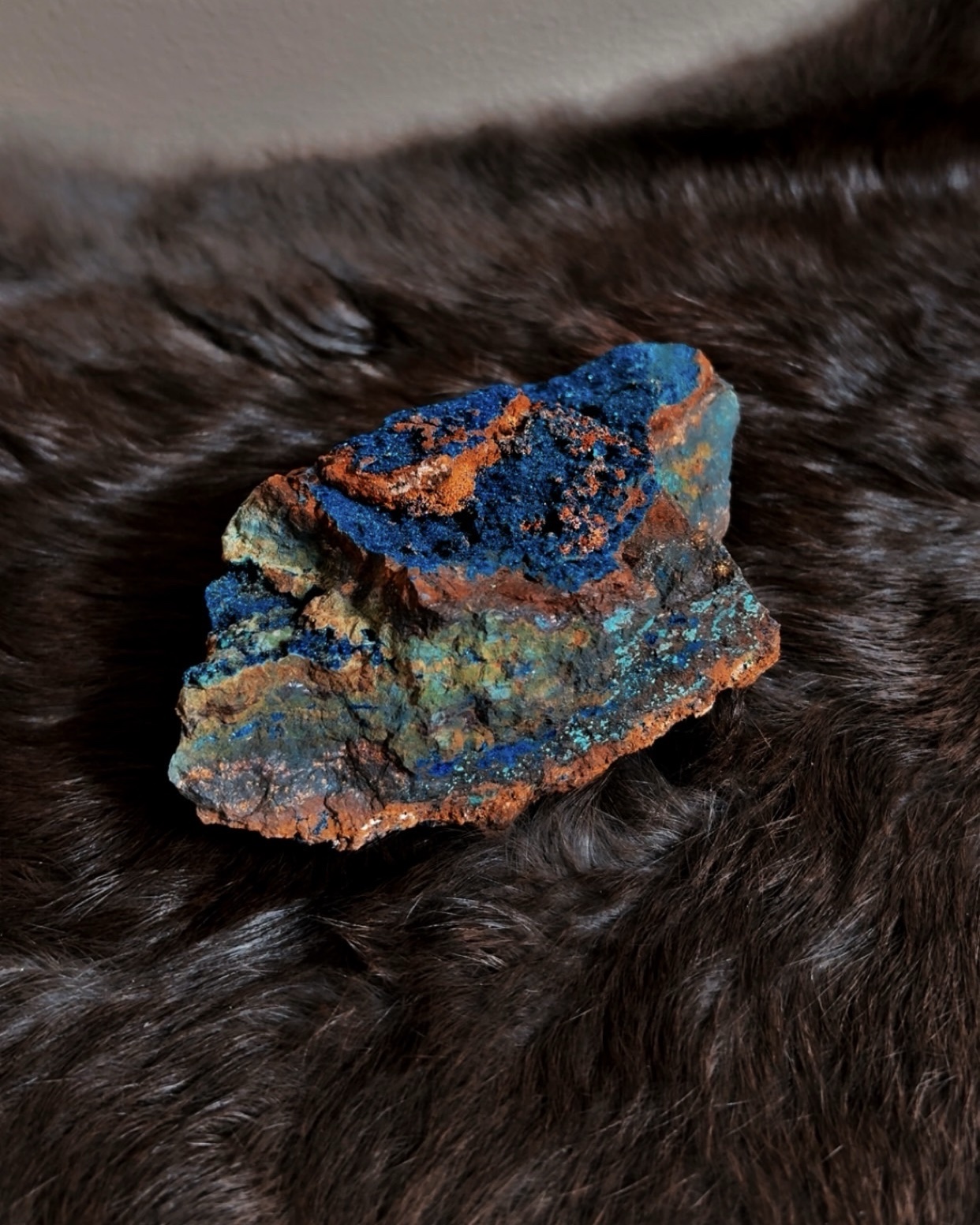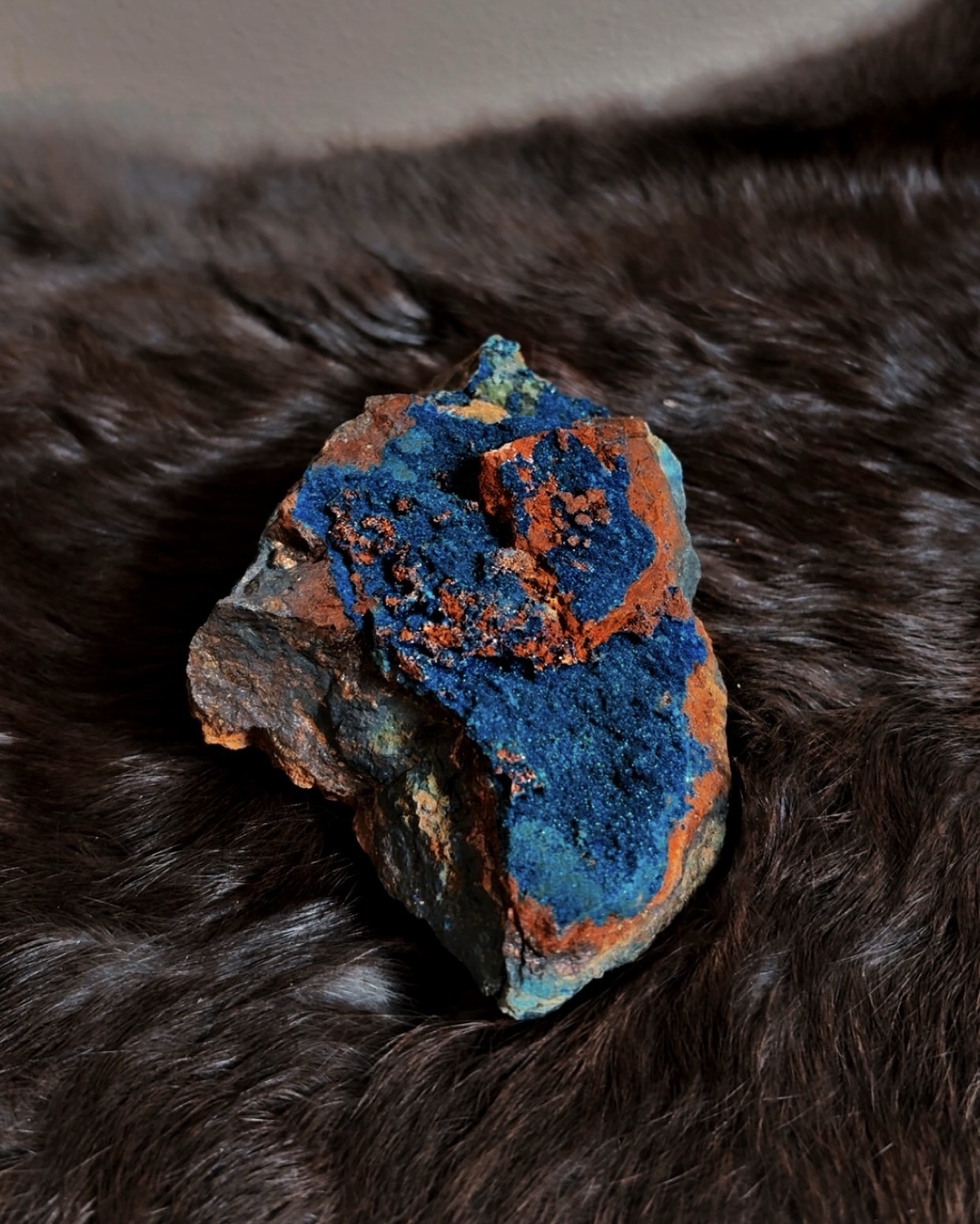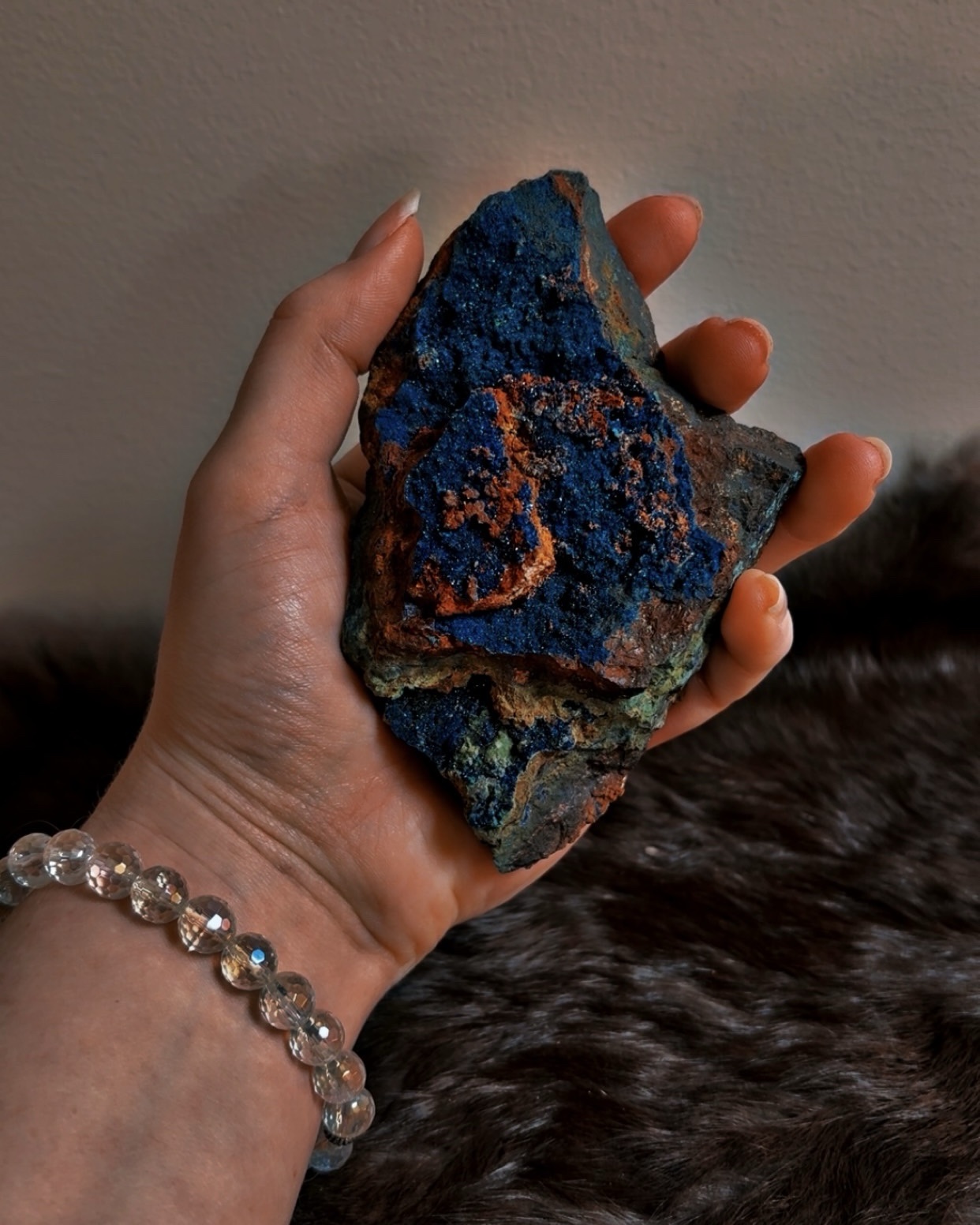 Azurite is a relatively soft mineral and should not be cleansed with water. Handle gently, avoid friction, and cleanse using smoke, sound, breath, or intentional visualization. Best displayed or worked with respectfully rather than carried.