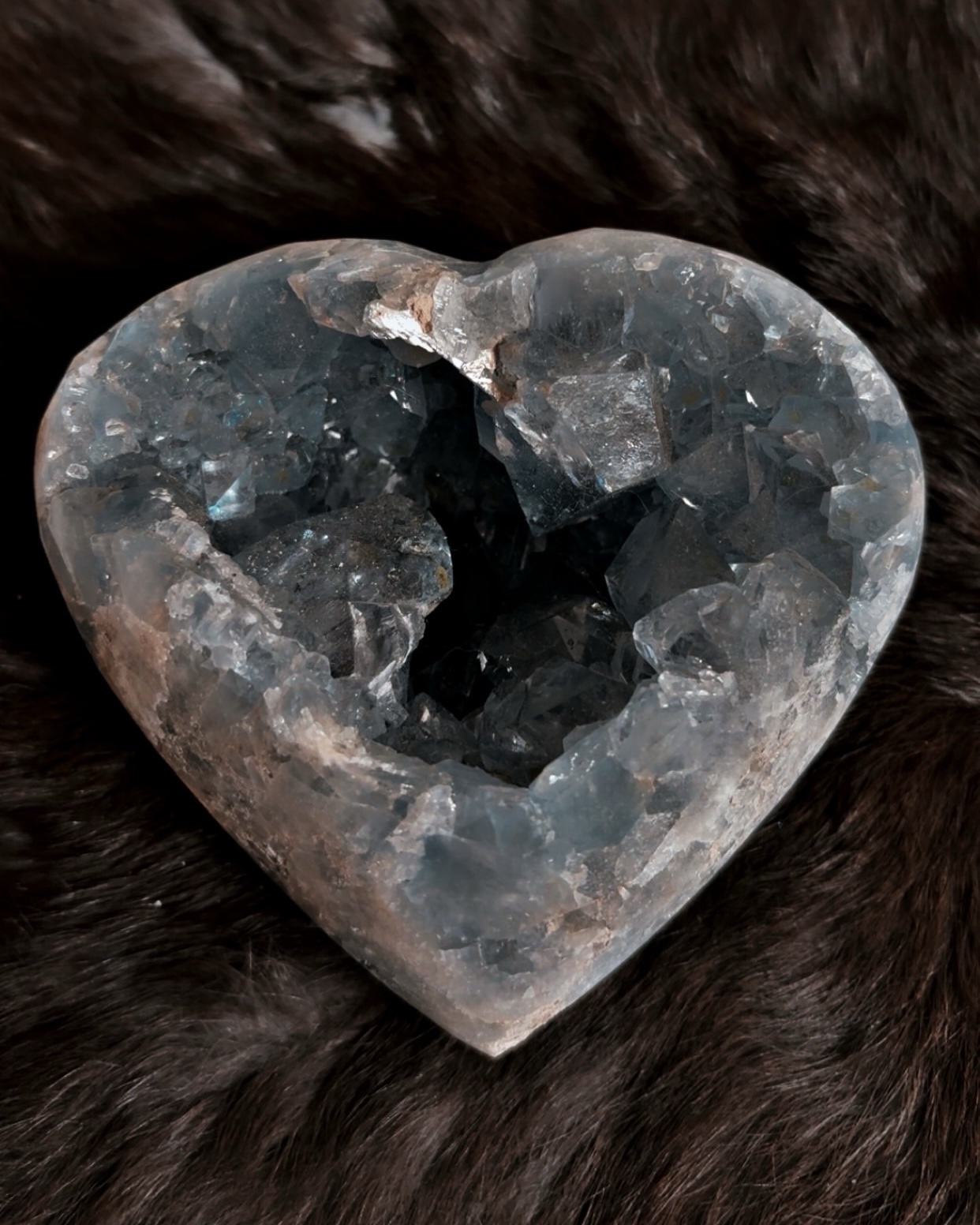 Celestite is often associated with angelic realms, higher guidance, and nervous system calming. It’s especially supportive during times of emotional overwhelm, grief, or mental fatigue, helping to quiet the mind and soften the heart. The heart shape amplifies themes of compassion, emotional healing, and self-soothing, while the natural crystal interior maintains the stone’s raw, high-frequency energy.