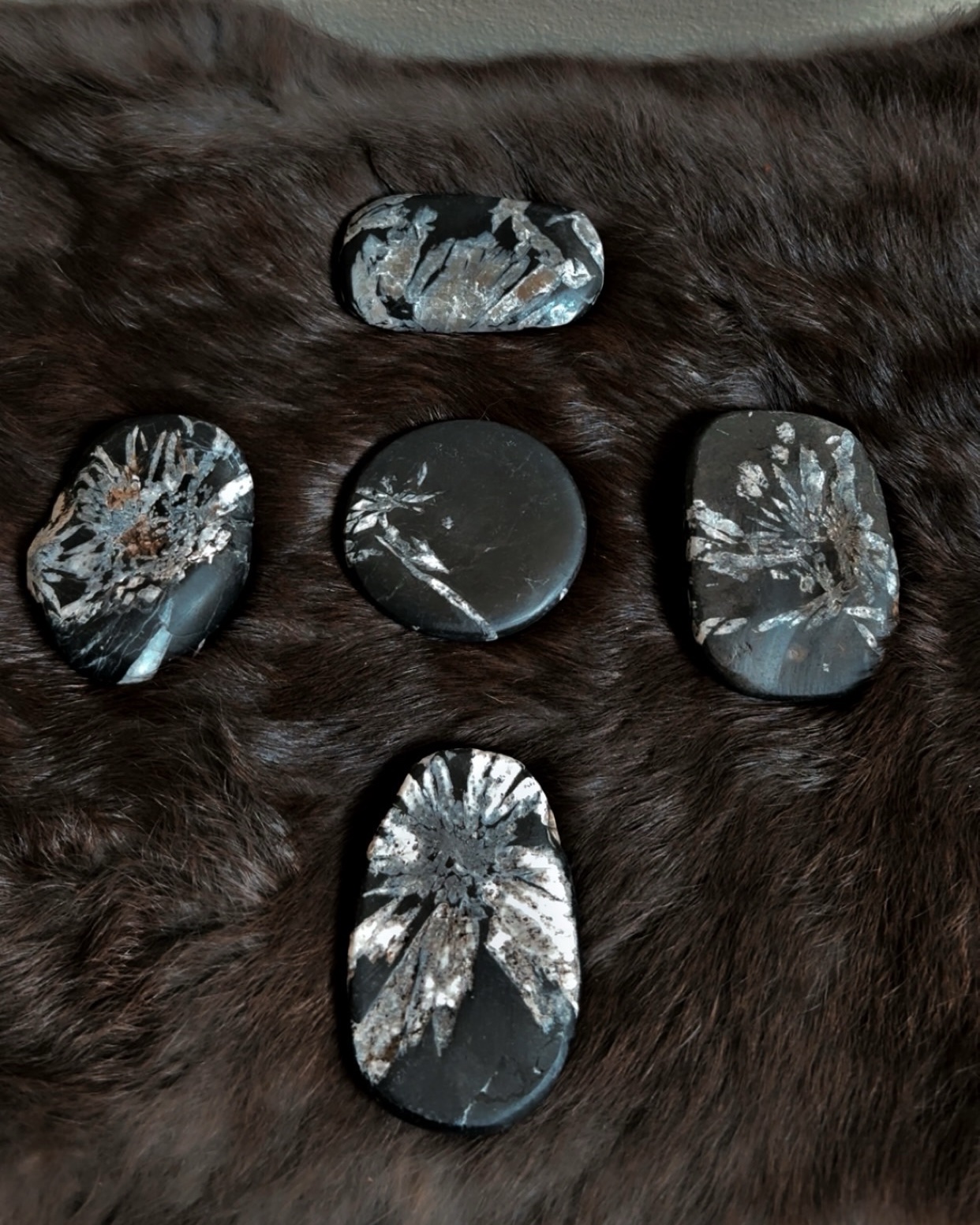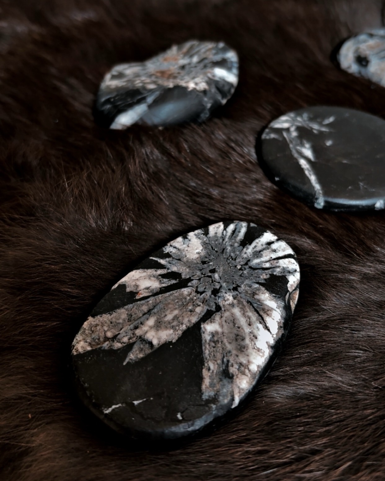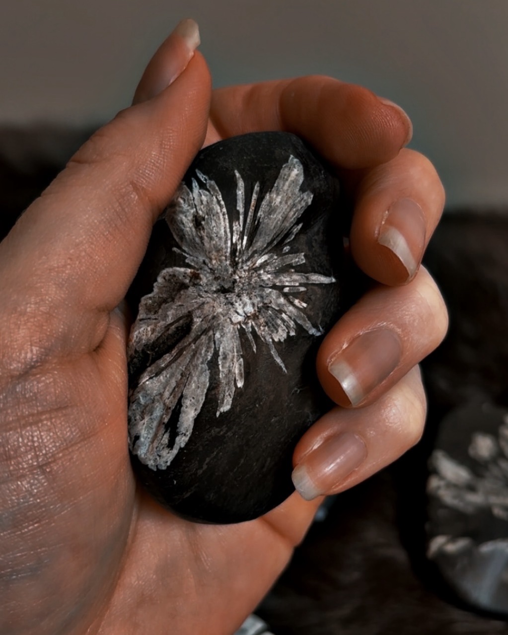 These Chrysanthemum Stone palm stones are truly uncommon and deeply symbolic. Naturally formed over millions of years, the pale “flower” patterns bloom organically through the dark stone — each one completely unique, like a fossilized moment of emergence and becoming.