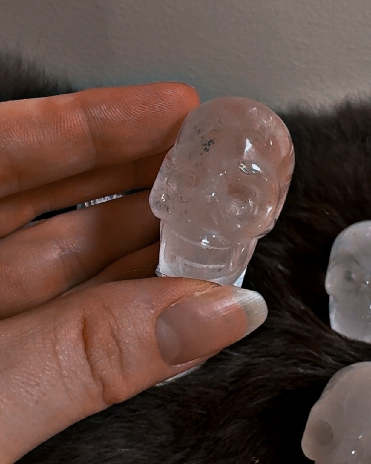 These mini Clear Quartz crystal skulls are exceptional pieces, both in material quality and in lineage. Each skull is carved from clear quartz and measures approximately 1.5”, making them small but energetically focused companions.