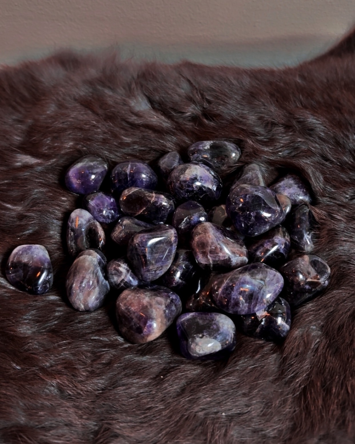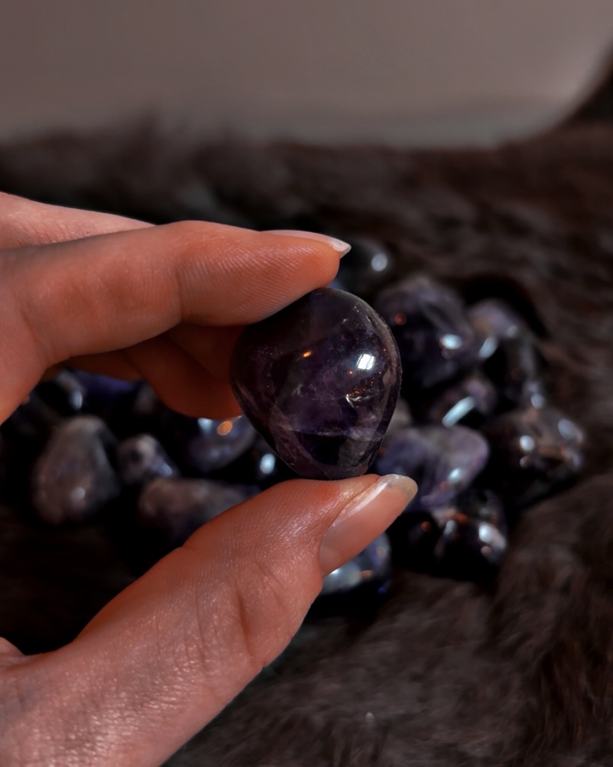 These tumbled Dark Amethyst stones are especially rich and saturated—deep violet and inky plum tones reminiscent of grape jelly, with subtle internal variations that catch the light beautifully. At approximately 1”, they’re a satisfying size with a noticeable weight and presence.