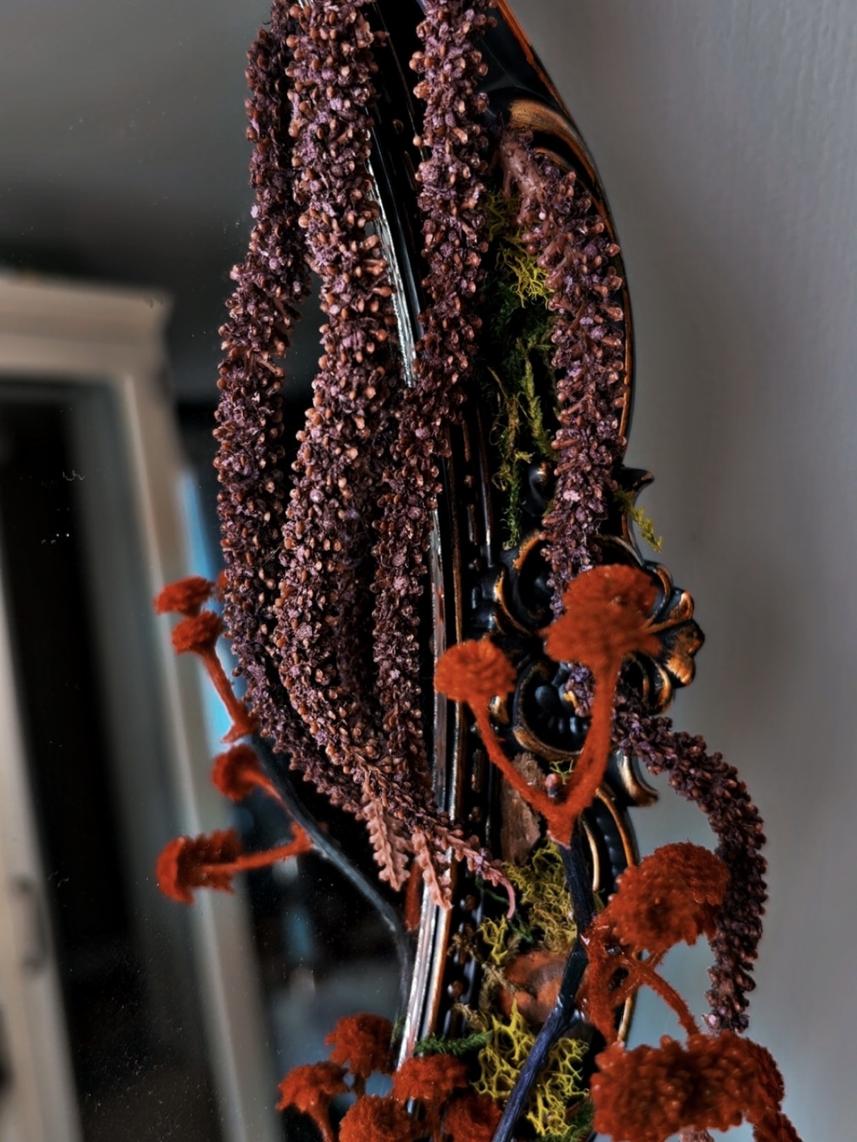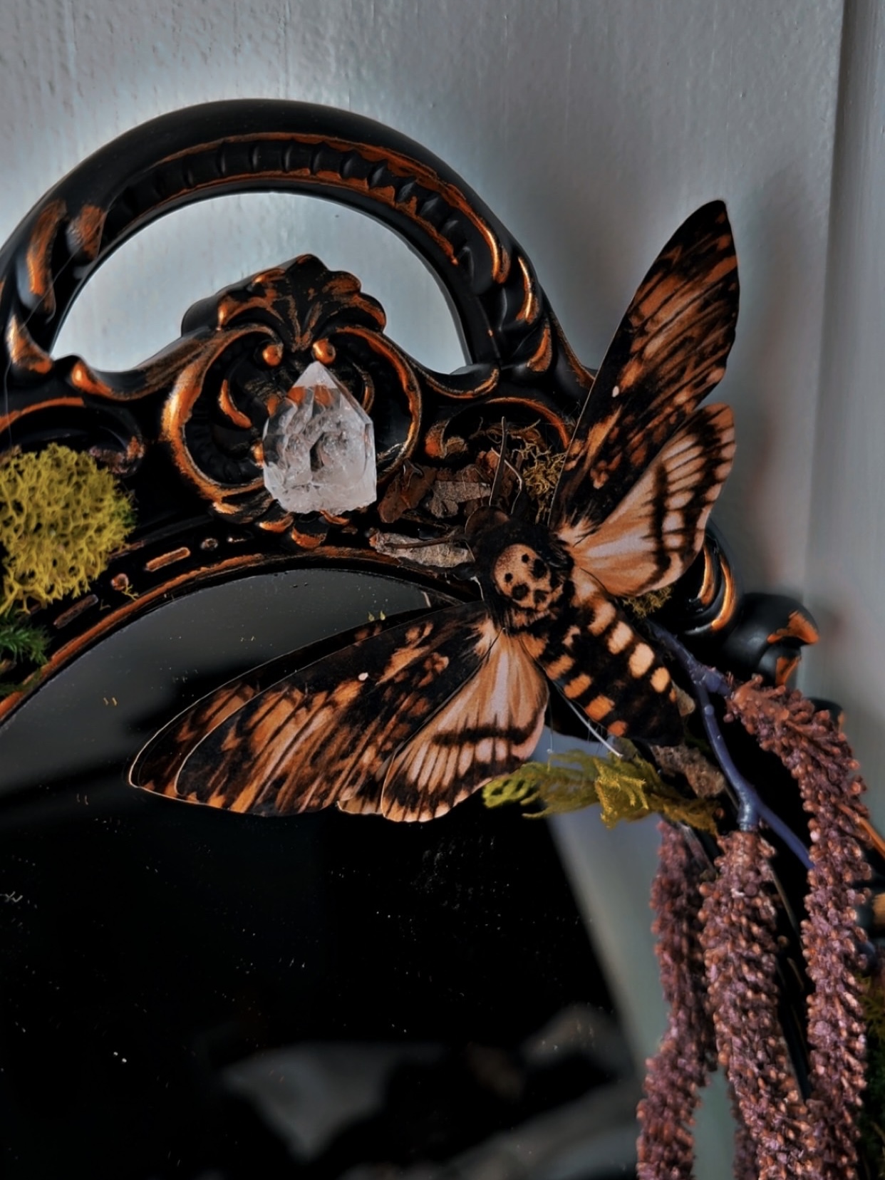 A death’s head hawkmoth spreads its wings at the crown, whispering of metamorphosis and shadow work. Preserved moss and crimson florals weave through the ornate frame, while a coiled ammonite fossil anchors the flow of ancient wisdom below. Amethyst and quartz crystals radiate clarity and grounding, inviting your gaze inward.