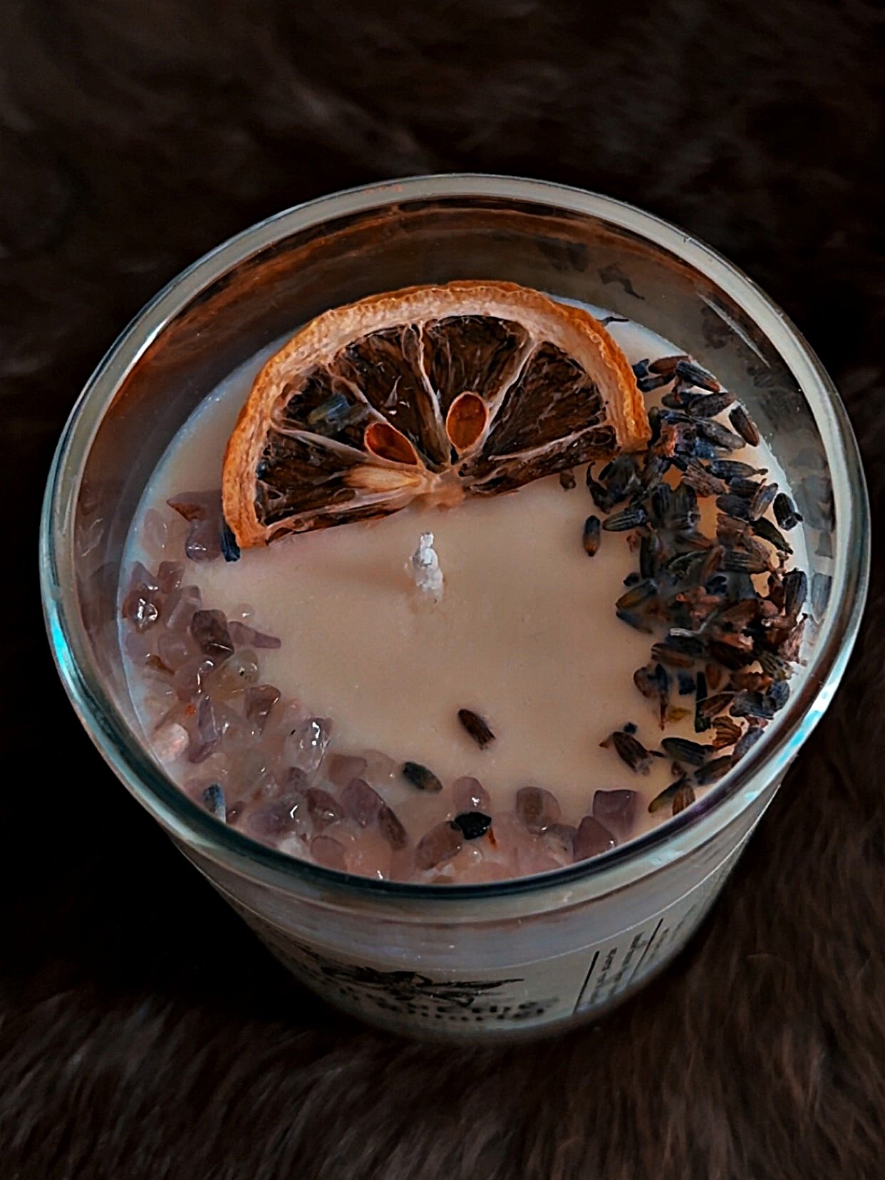 Adornments: Dried Lemon Slice, Lavender, Amethyst Chip Stones