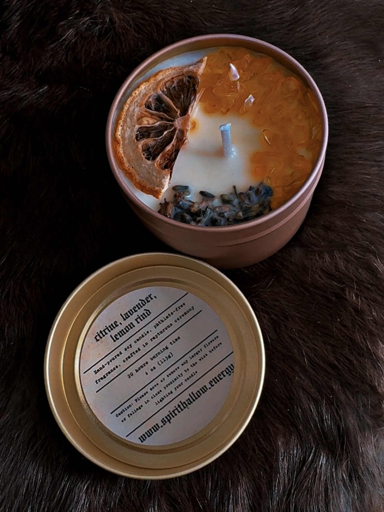 Adornments: Citrine, dried lavender, dried lemon slice