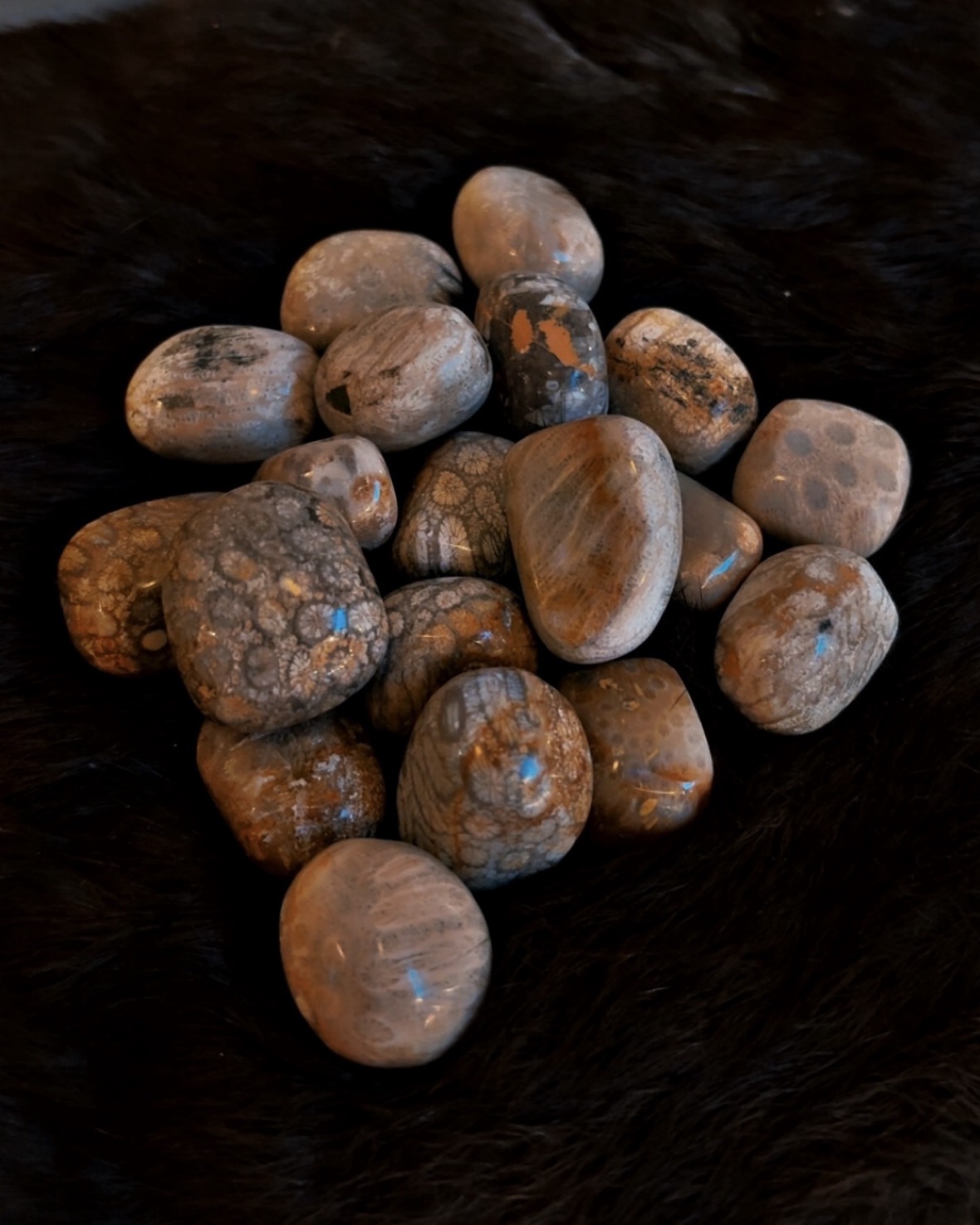 These tumbled Fossilized Coral stones feature beautiful organic patterns formed from ancient coral structures, preserved over millions of years and transformed into stone. Each piece carries natural circular, floral, or cellular markings in warm neutrals — creams, tans, browns, soft grays, and muted honey tones — making every stone completely unique.