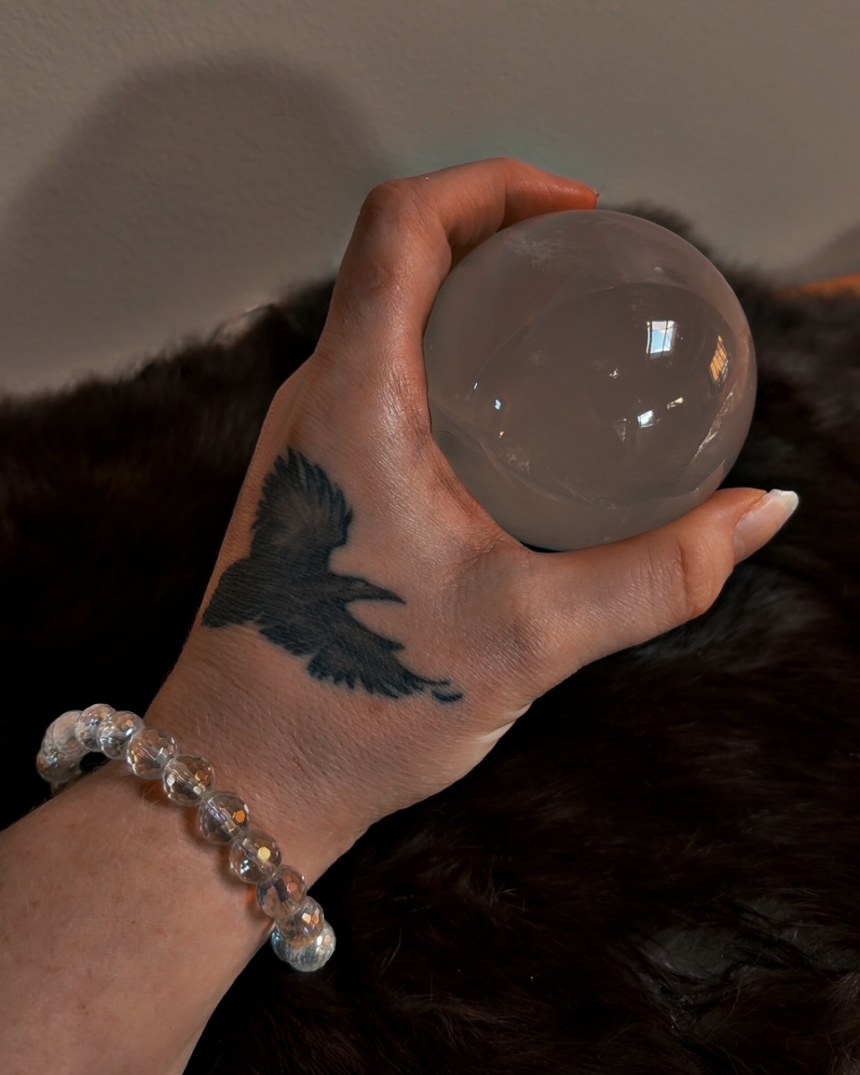 This girasol quartz sphere carries a gentle, misty glow that feels more like moonlight than stone. Often called moon quartz, girasol is known for its soft translucence and subtle inner light—an energy that doesn’t demand attention, but steadily calms and clarifies.