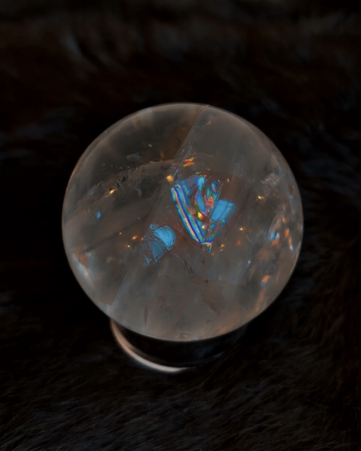 The sphere shape allows light to travel freely through the stone, highlighting both its clarity and its subtle internal landscapes. The rainbow inclusion adds a moment of brilliance and depth, giving this piece a distinctly expressive, almost conversational presence.