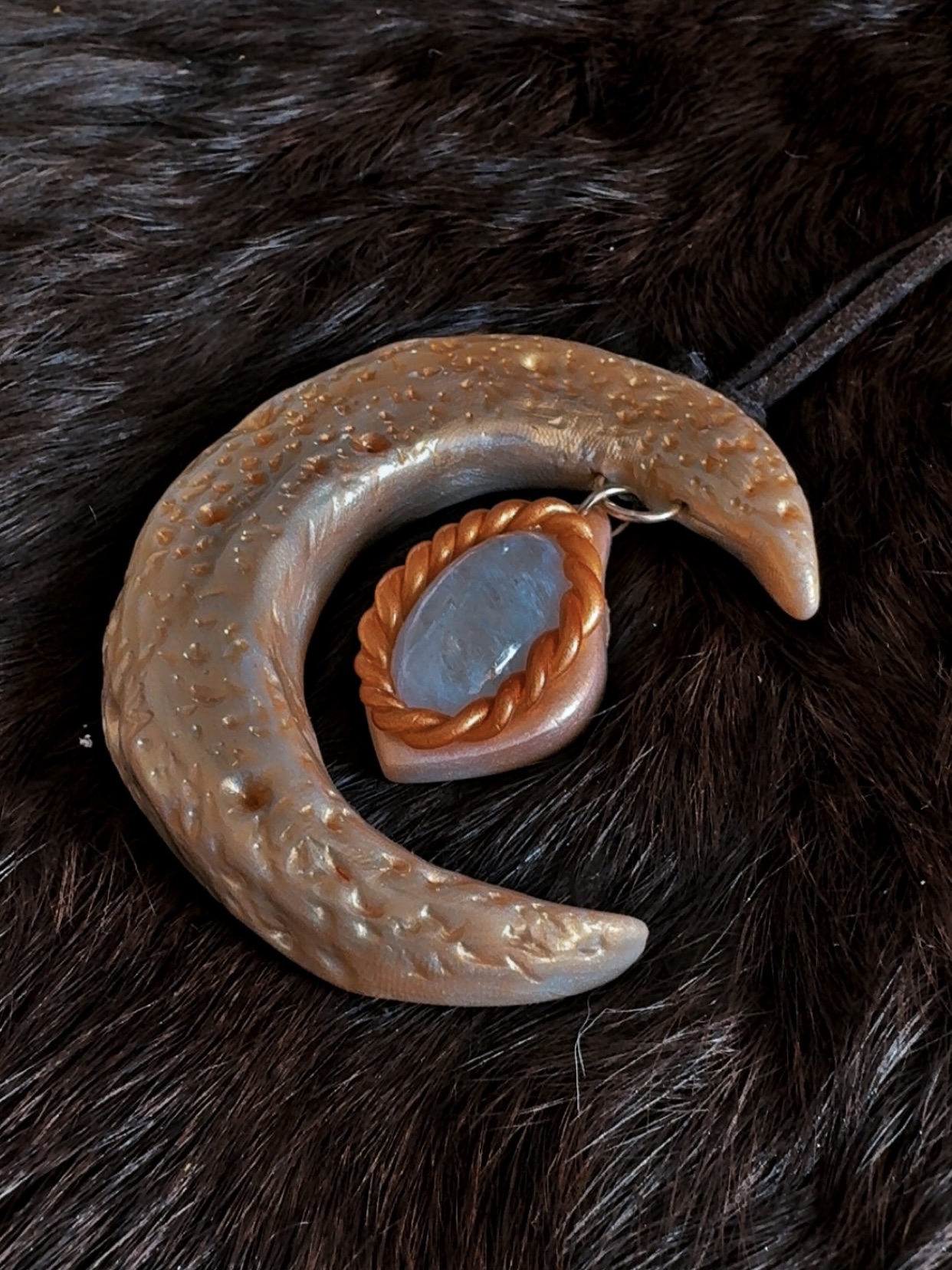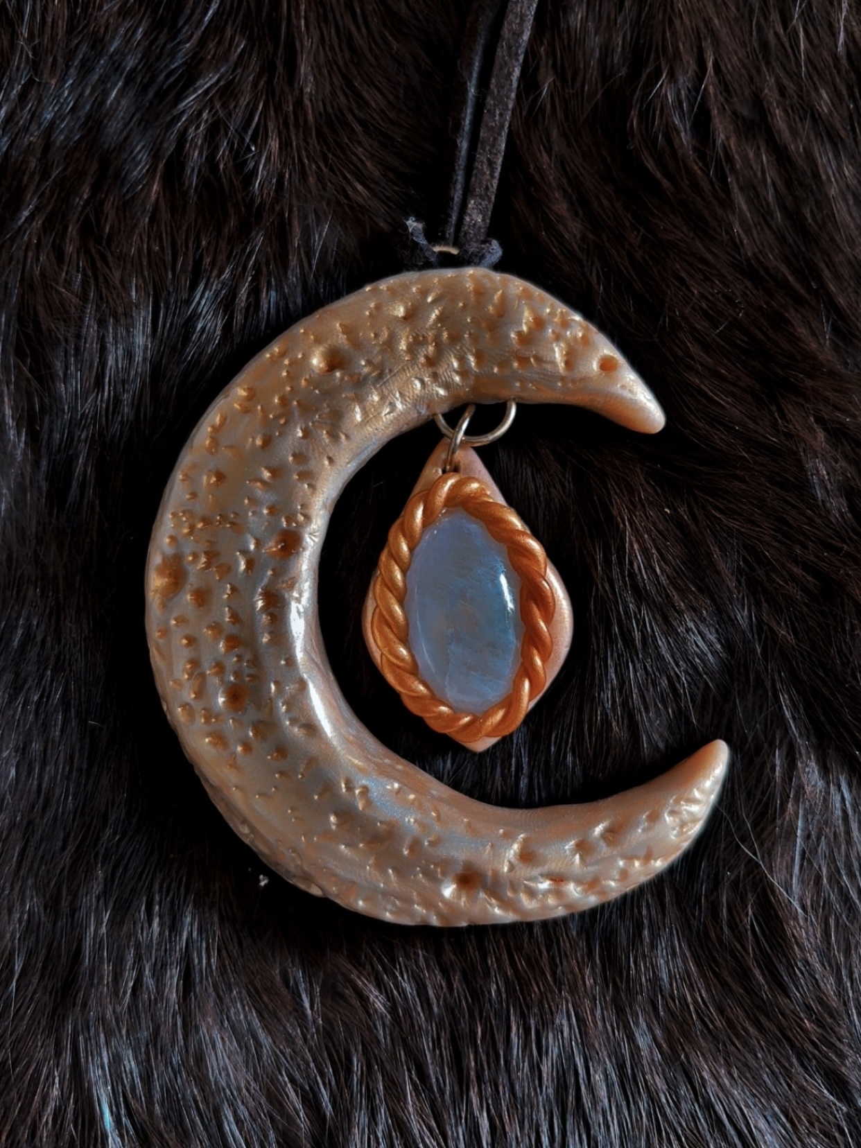 Materials: AAA-grade moonstone, Sculpey III polymer clay, metallic pigment powder, and sealed with Sculpey gloss glaze.