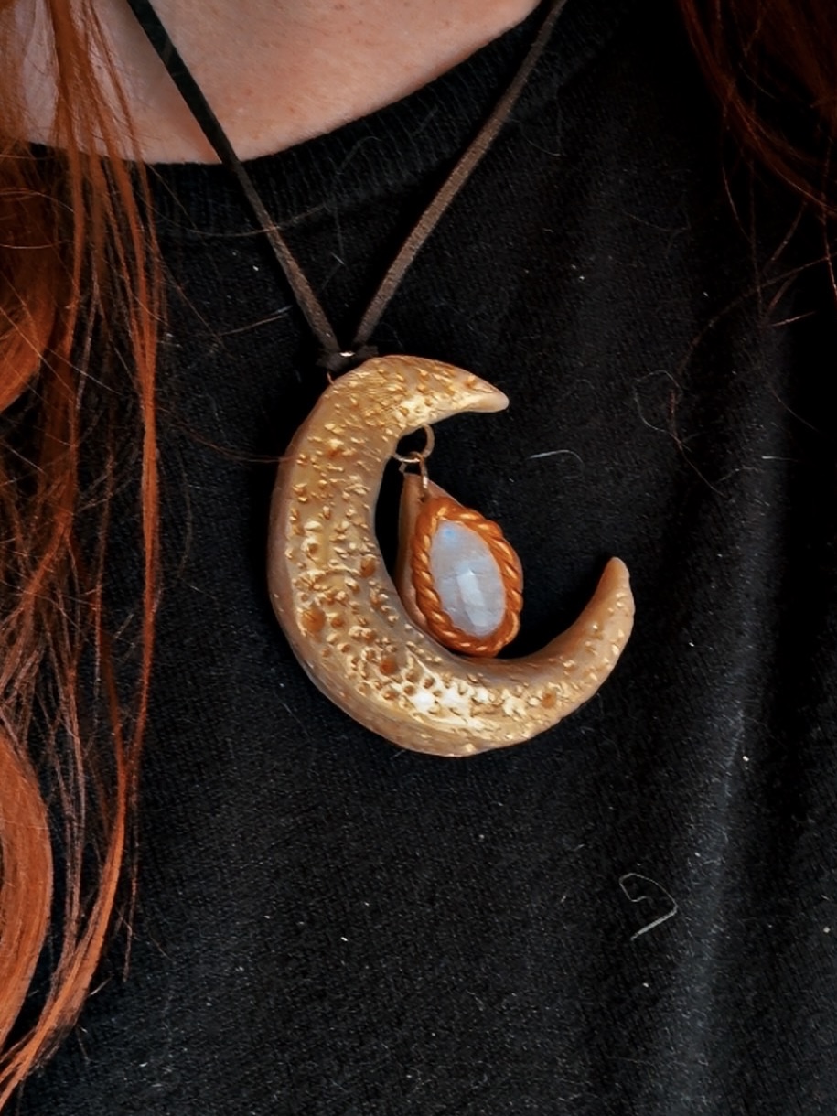 Embrace celestial allure with our handcrafted Golden Crescent Moon Pendant, a whimsical creation that captures the enchantment of the night sky. Fashioned from the finest polymer clay, this luminous piece glimmers with an intricate golden finish that evokes the gentle glow of a moonlit night. At its core, a breathtaking AAA moonstone crystal—one of nature’s most mystical gemstones—reigns, catching the light and shimmering with an ethereal beauty that will leave you spellbound.