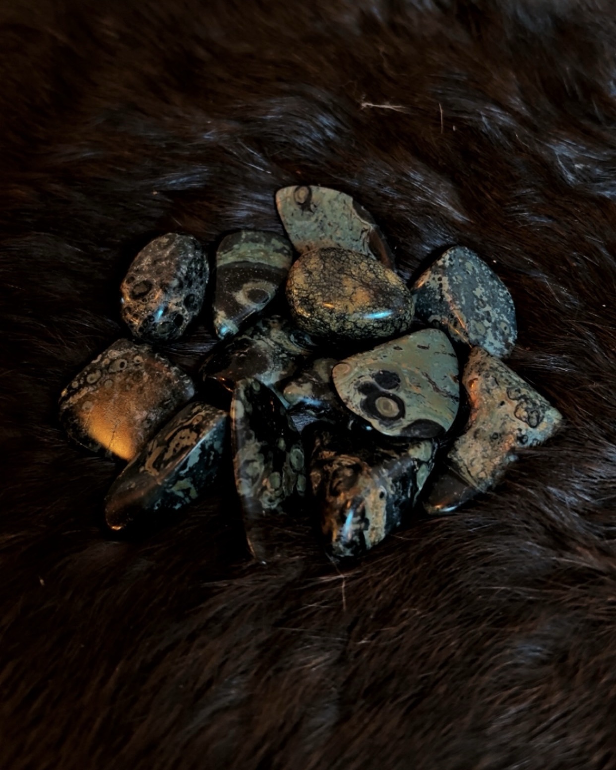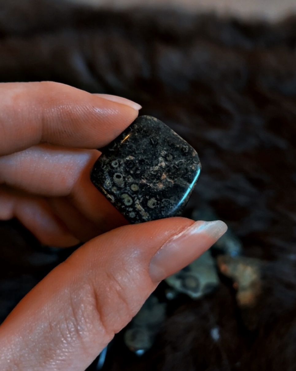 These Kambaba Jasper tumbled stones carry a deep, primordial calm. Characterized by dark green to nearly black tones with distinctive swirling orb patterns, Kambaba Jasper is believed to be one of the oldest stones on Earth — a fossilized stromatolite formed from ancient algae billions of years ago.