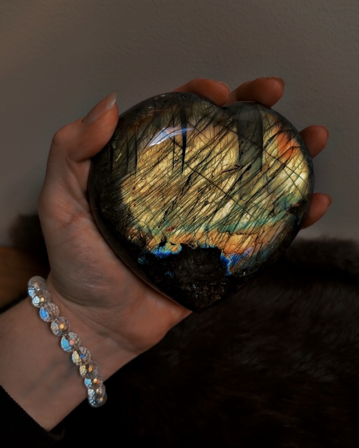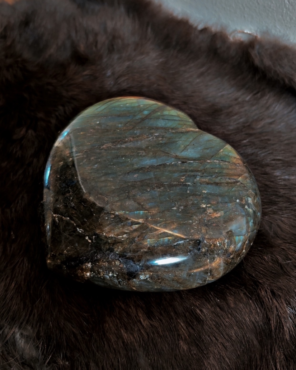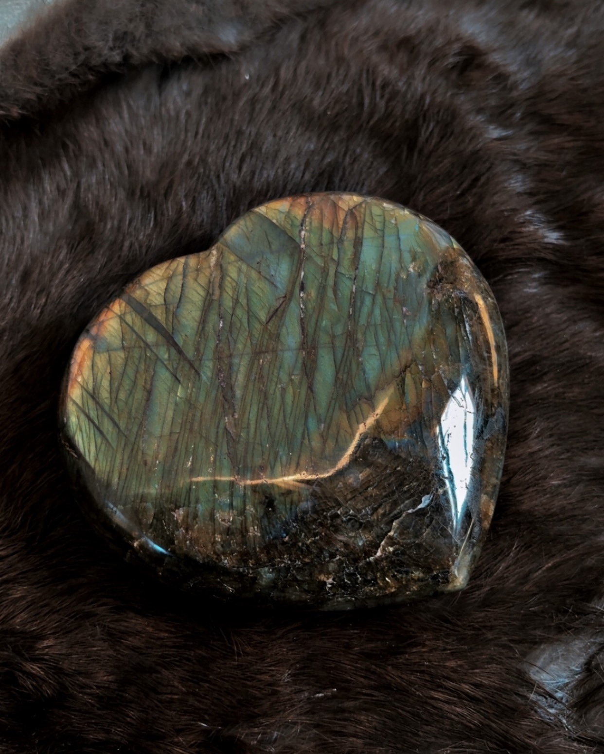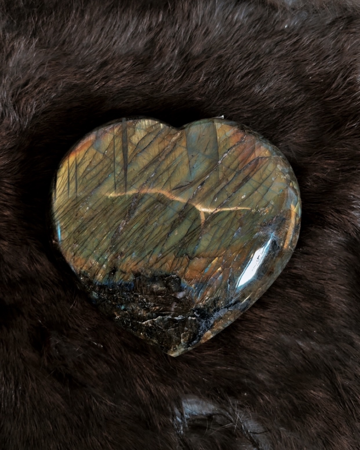 Carved into a heart shape, this piece bridges intuition with emotional wisdom — helping one remain open-hearted while protected. The luminous flashes of gold, blue, and green that move across the surface reflect labradorite’s role as a mirror between realms, revealing insight, truth, and hidden potential as the light shifts.