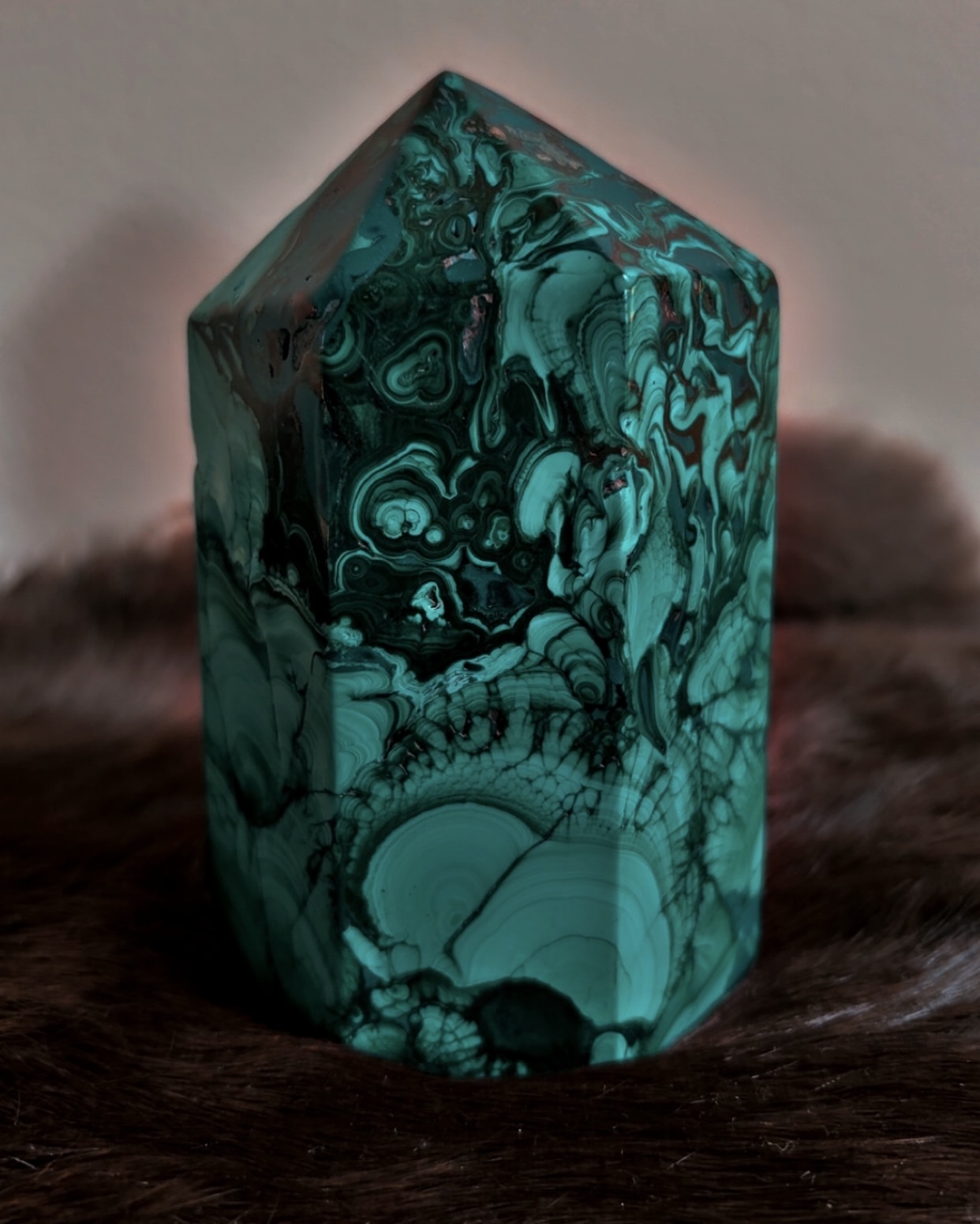 Carved into a generator form, this piece directs malachite’s powerful energy upward and outward, making it especially effective for focused intention work, boundary-setting, and clearing stagnant or inherited energetic patterns. This is not a passive stone; it works best with those ready to meet themselves honestly and step into greater personal authority.