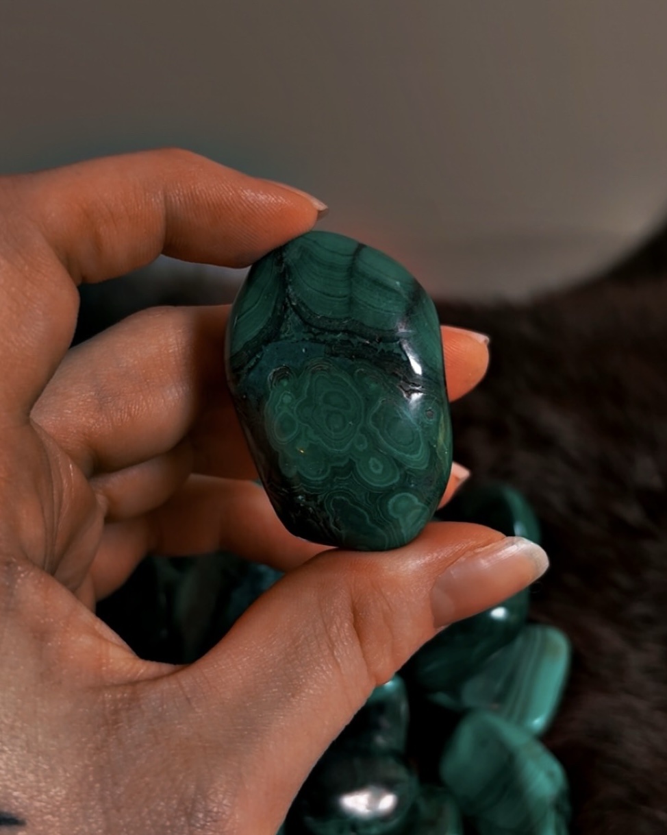 These tumbled Malachite stones are bold, saturated, and unmistakable—layered with deep emerald and forest-green banding that feels alive with movement. Each piece is naturally patterned, with no two stones ever alike.