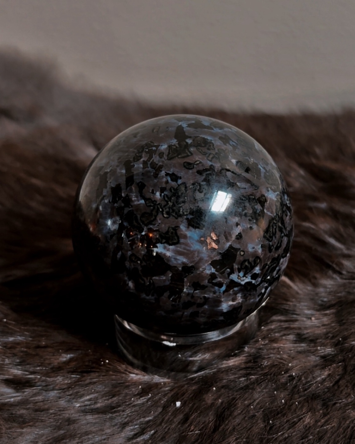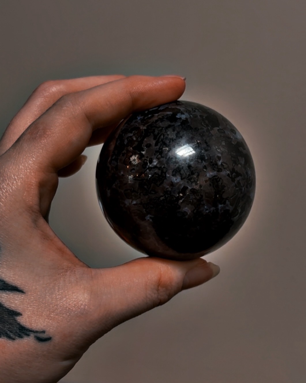 Merlinite—also known as Indigo Gabbro—is a deeply mystical stone associated with inner vision, shadow integration, and the balance between light and dark. This Merlinite sphere features smoky charcoal tones layered with soft gray and indigo patterning, giving it an otherworldly, nocturnal presence.