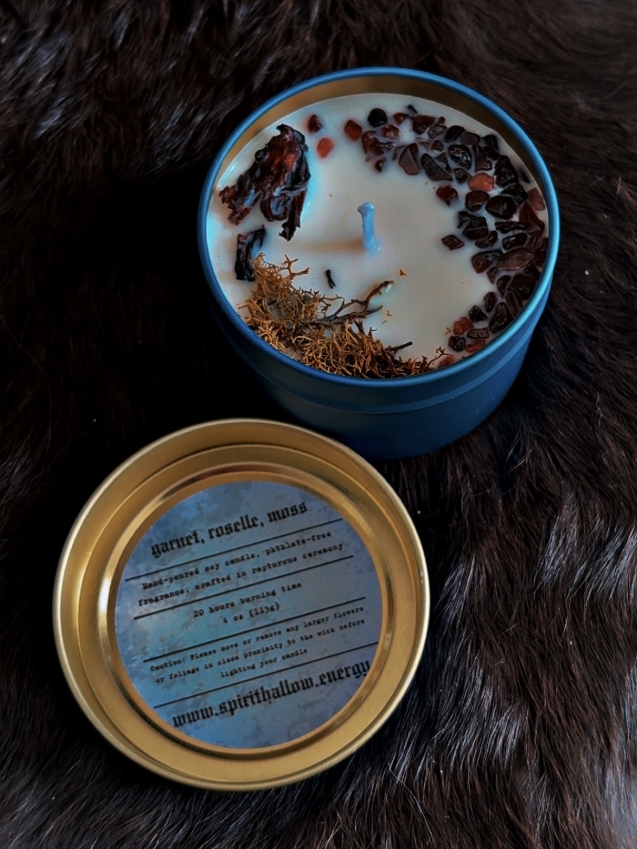 A candle that captures the pulse of New Orleans at midnight: earthy, mysterious, and alive with unseen whispers. Dirt and night air ground the spirit in deep protection, while garnet stones ignite courage and vitality. Dressed with roselle for blood-deep resilience and moss for connection to the ancient green world, this vessel is a charm for strength and shadow-work, a companion for rituals of grounding and ancestral communion.