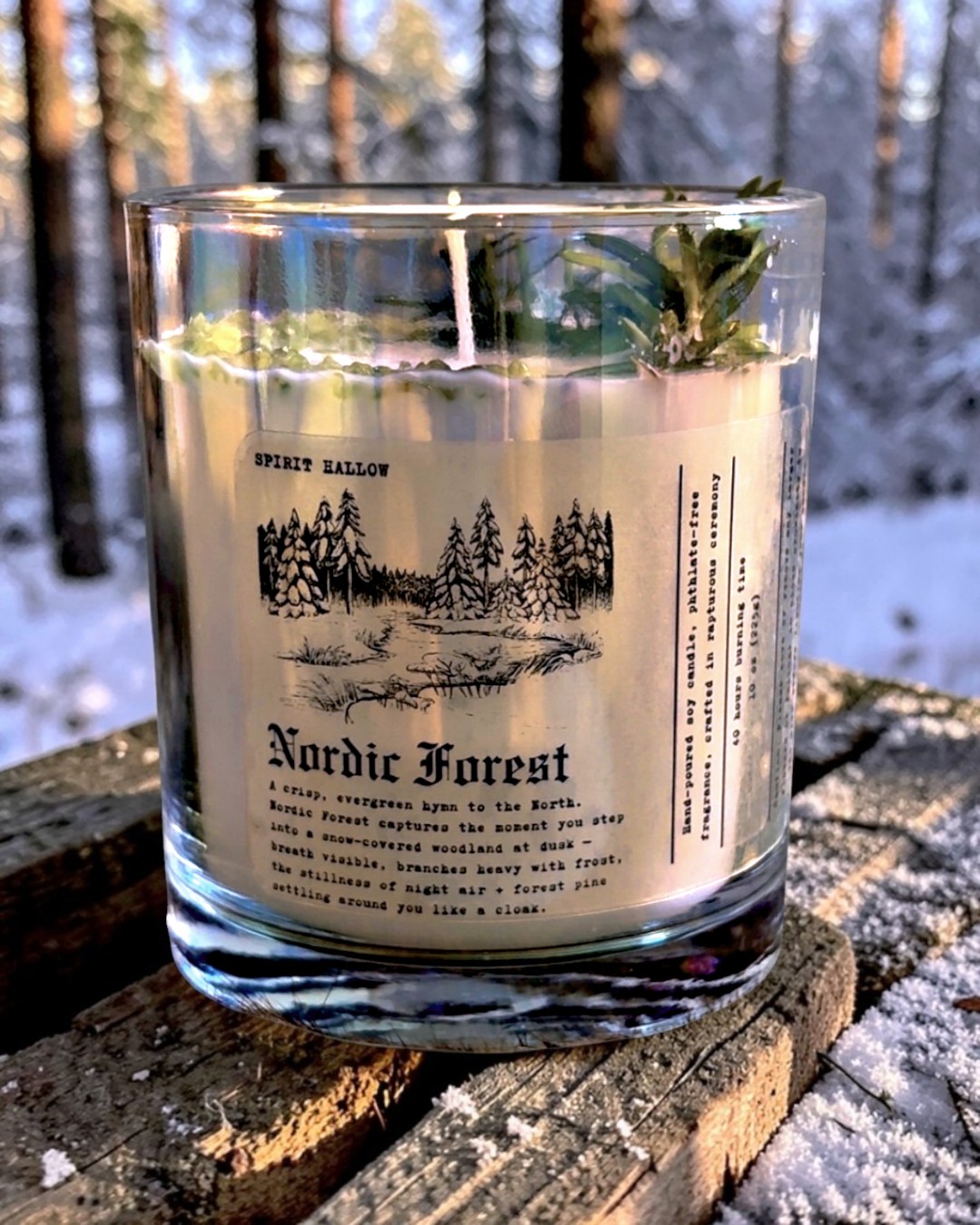 Nordic Forest is a crisp evergreen hymn to the North; the scent of stepping into a snow-covered forest at dusk, breath visible, branches heavy with frost, stillness settling around you like a cloak. Cool night air merges with deep forest pine to create a scent that’s grounding, expansive, and utterly atmospheric.