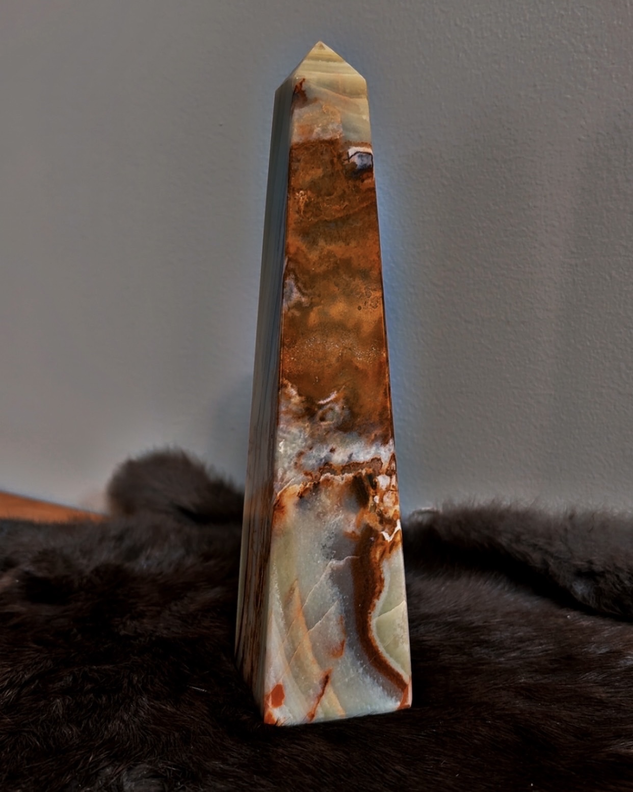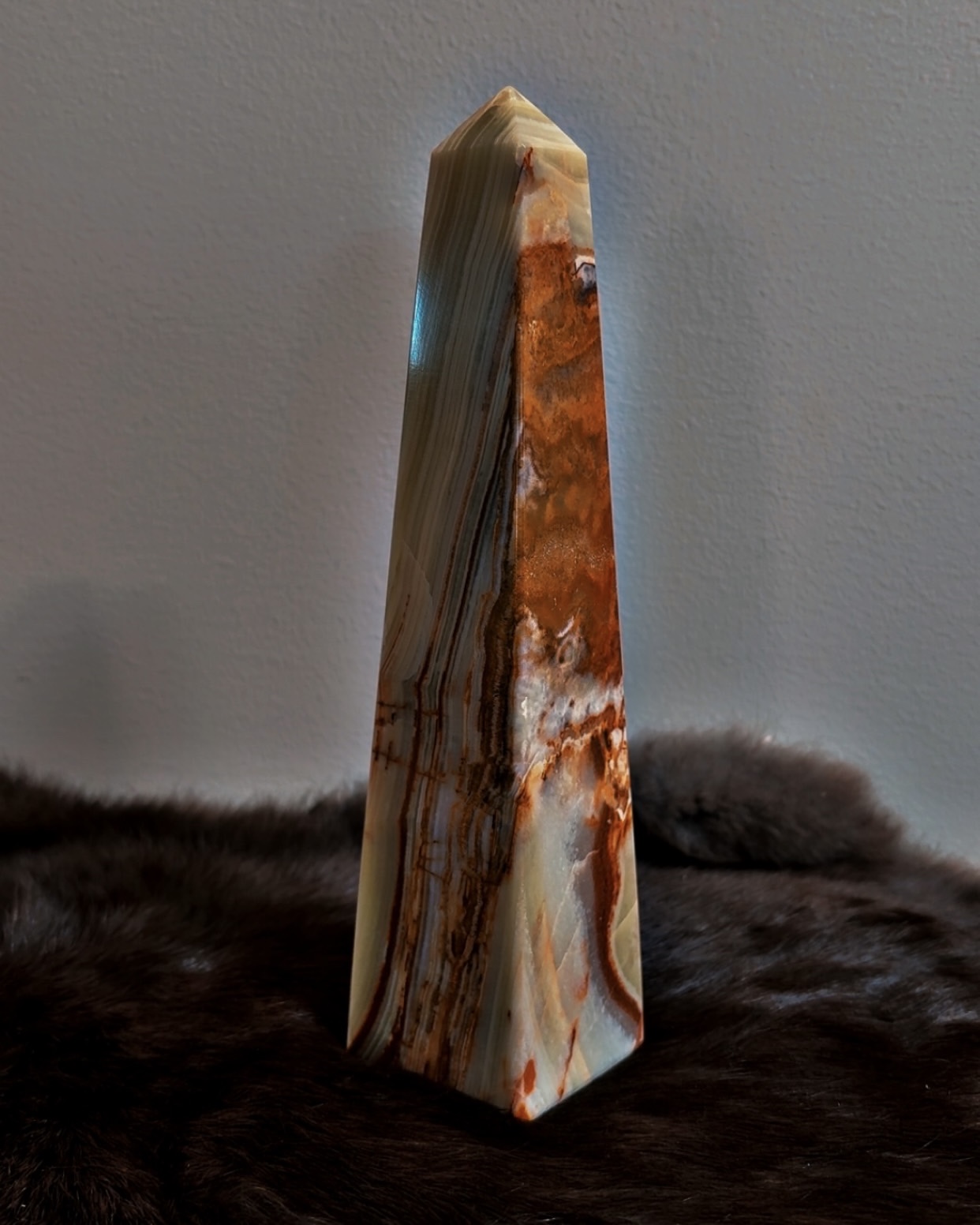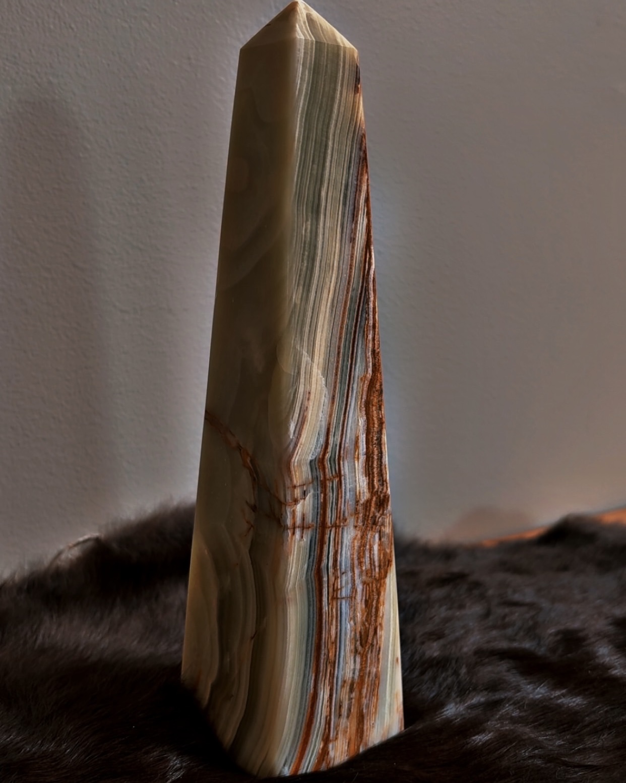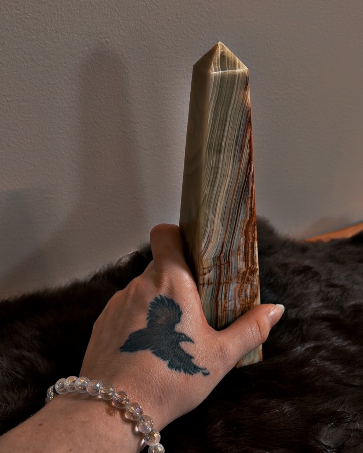 This one-of-a-kind onyx obelisk carries a steady, sentinel-like presence. Tall and refined, with striking natural banding, it feels less like a decorative piece and more like a keeper of space — anchoring boundaries, reinforcing personal sovereignty, and lending strength during times that require emotional or energetic containment.