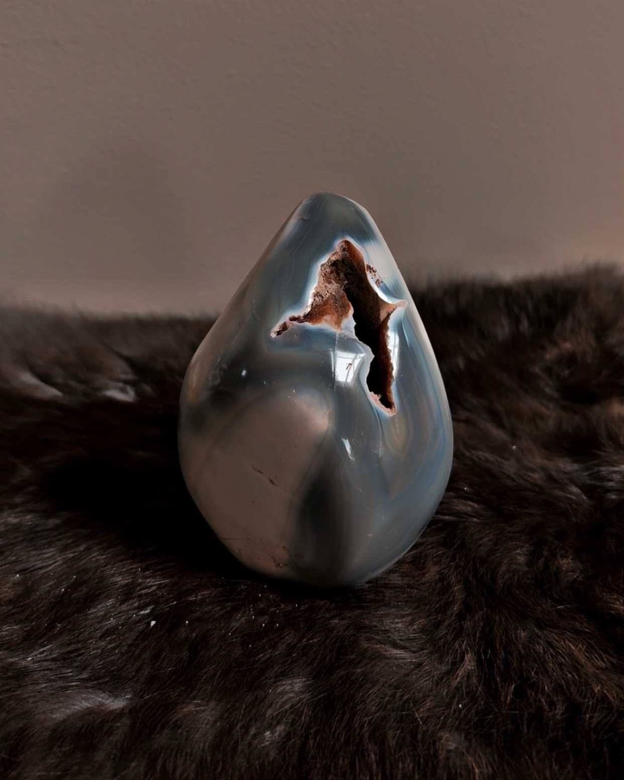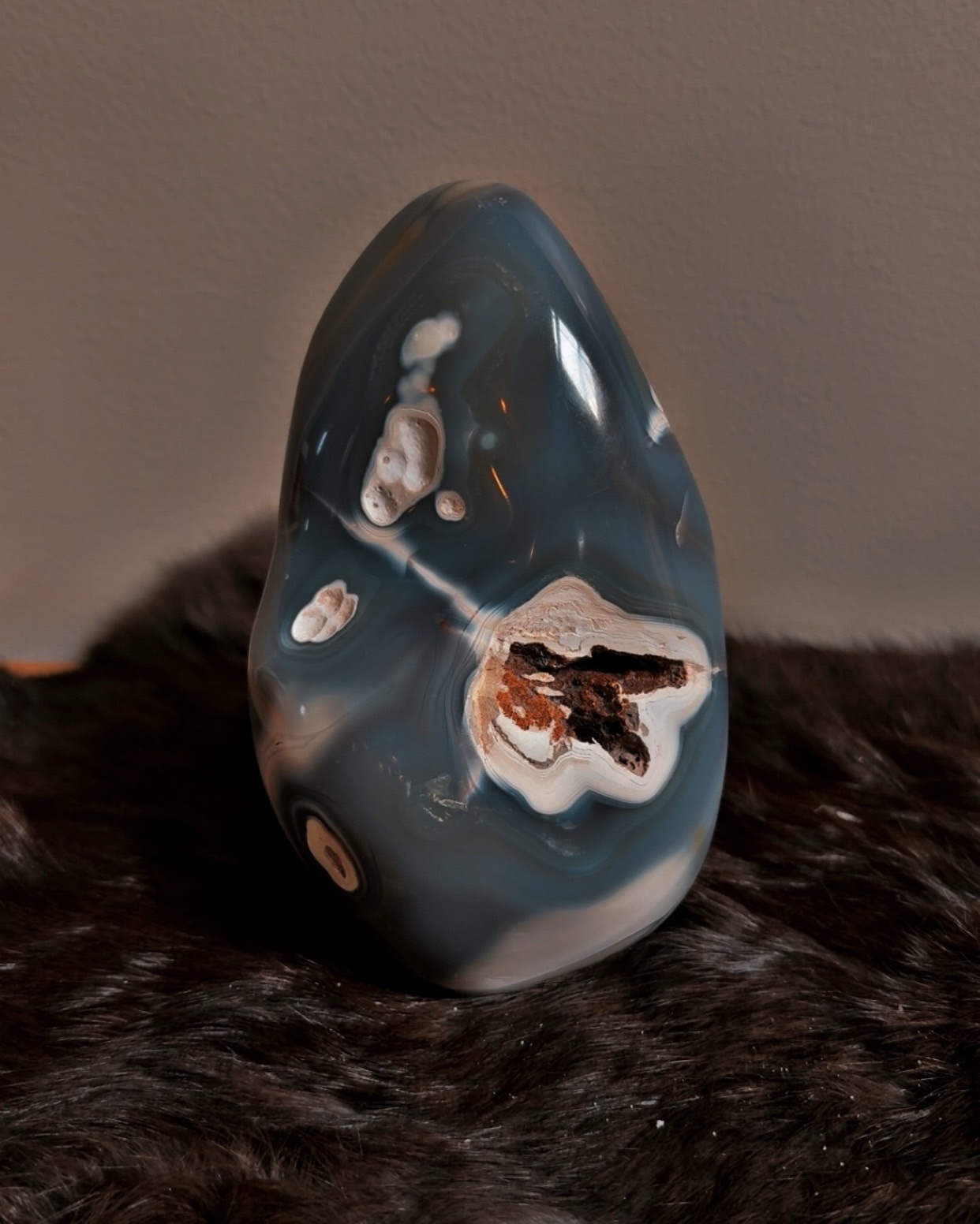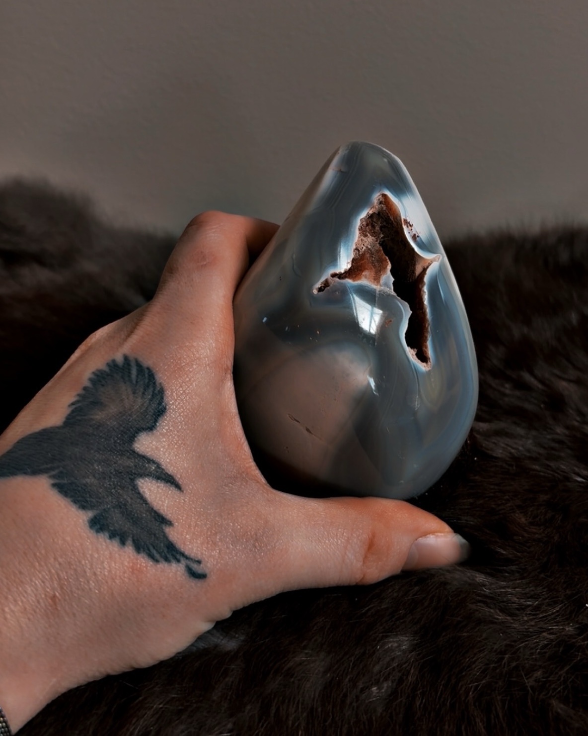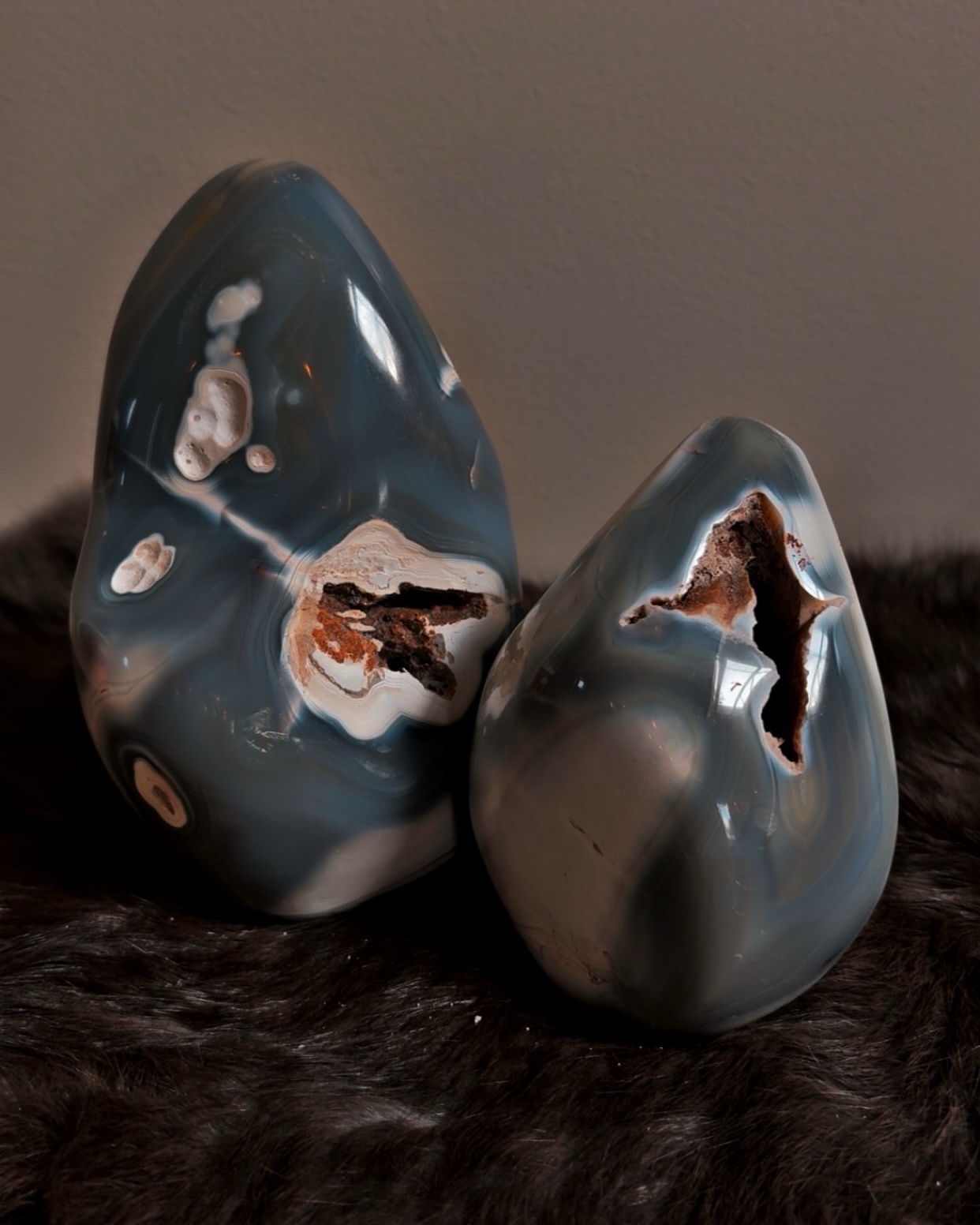 Orca Agate is a rare and deeply contemplative stone, named for its oceanic palette of smoky blues, stormy grays, and soft white inclusions that echo the depths of the sea. This Orca Agate freeform carries a quiet but powerful presence, offering support for emotional processing, ancestral healing, and inner stillness.