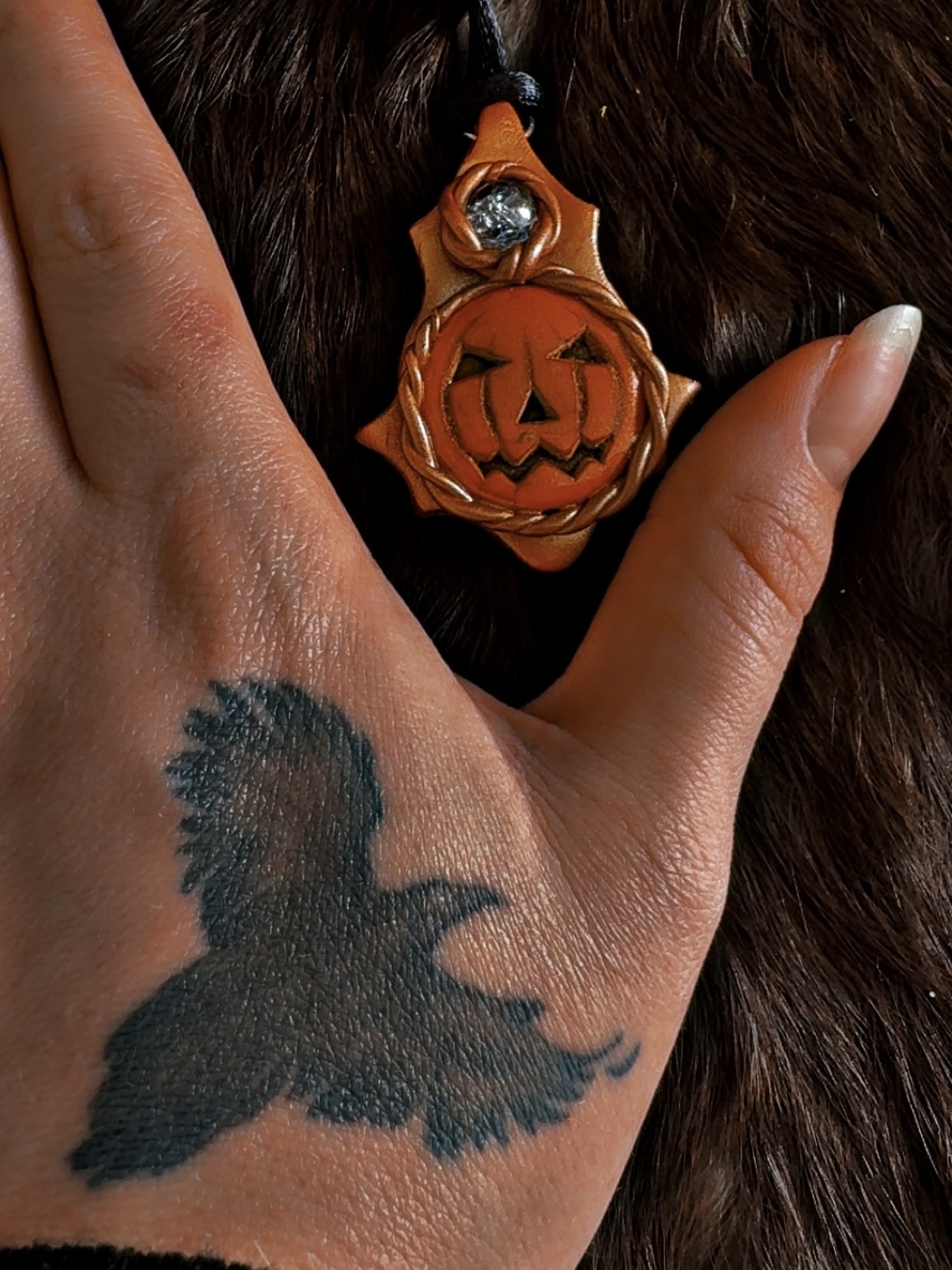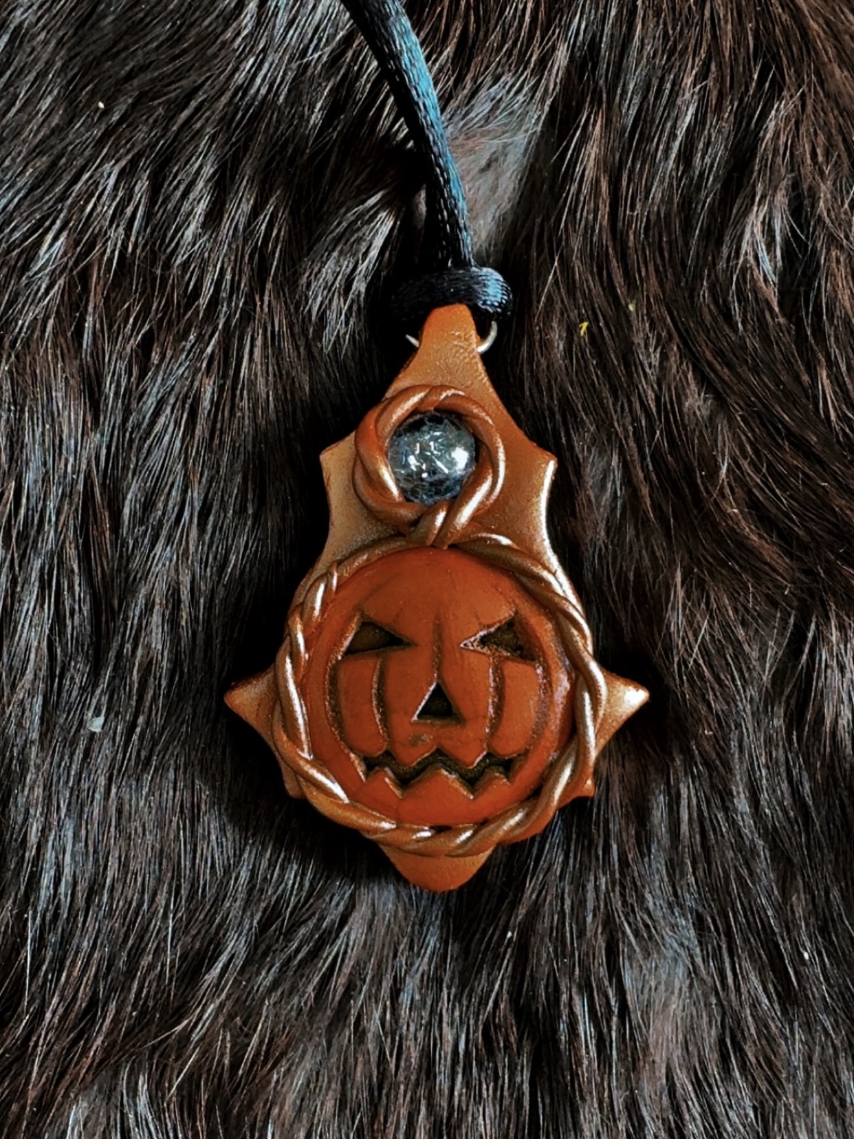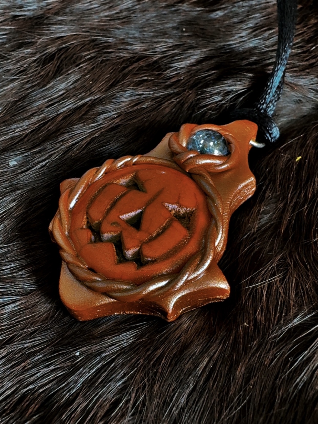 - Materials: Polymer clay, orange howlite pumpkin, accent stone