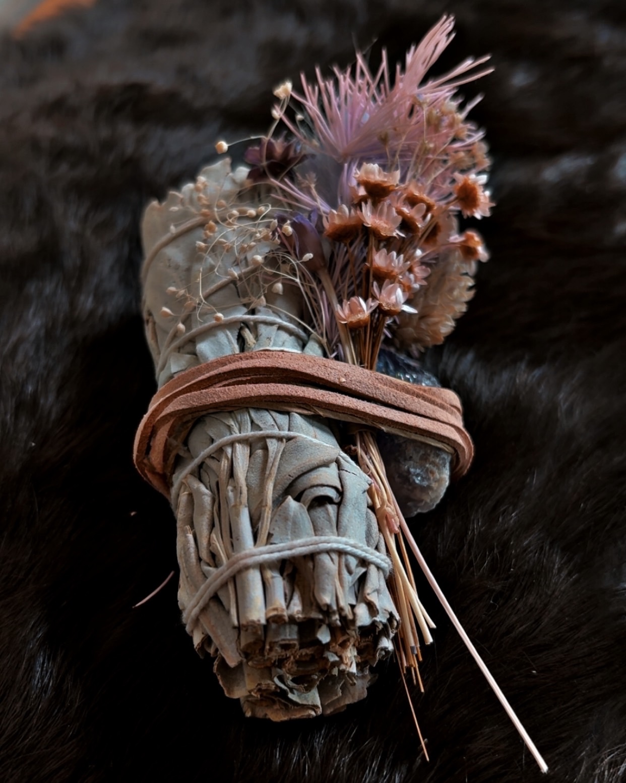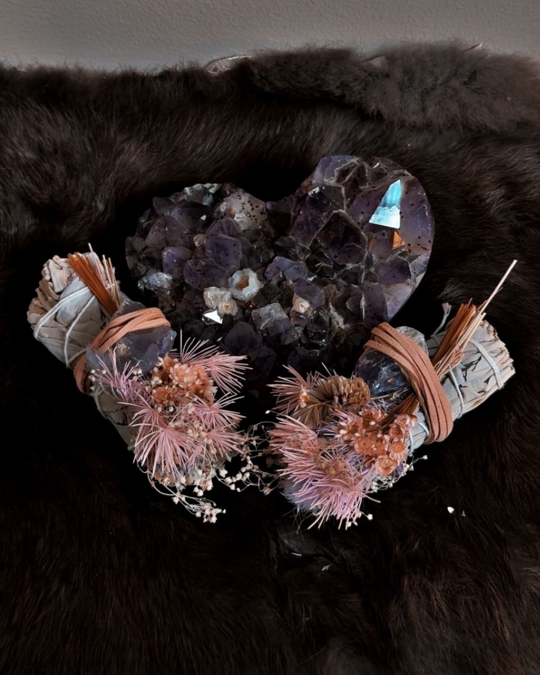 Purple Cleanse is a softly protective smudge bundle designed to clear stagnant energy while maintaining a calm, grounded atmosphere. Made with sustainably sourced white sage, adorned with a natural amethyst point and delicate dried flowers, this bundle blends traditional smoke cleansing with higher-vibrational spiritual support.