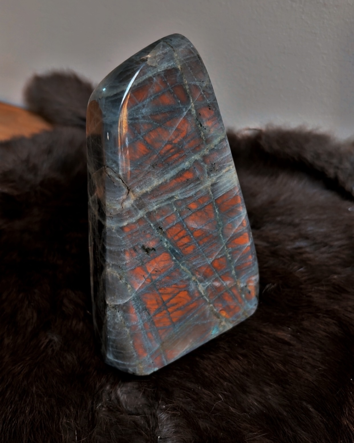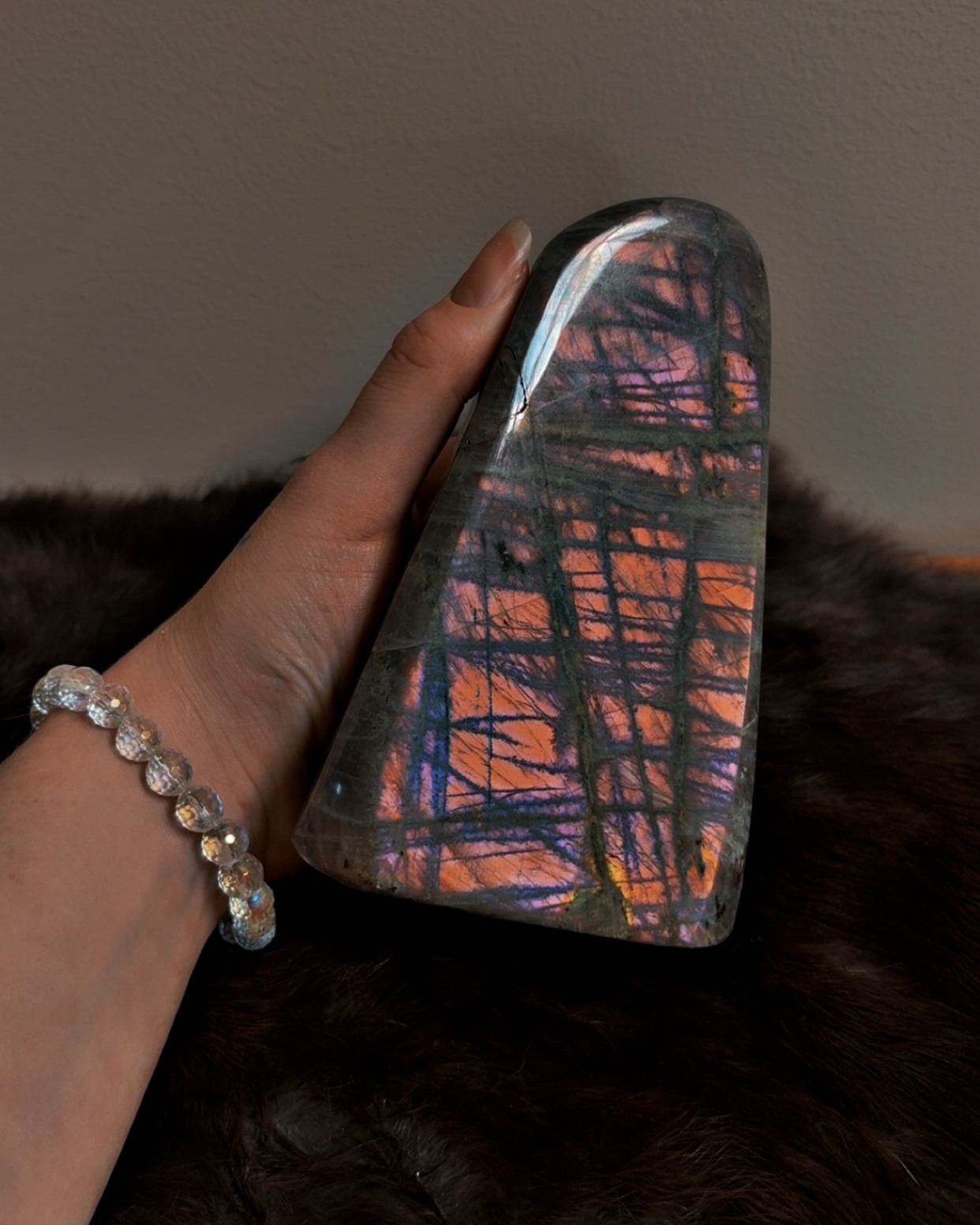This one-of-a-kind labradorite freeform carries a potent, watchful energy — a stone of thresholds, perception, and quiet power. The vivid flashes of copper, rose-gold, and violet move beneath the surface like hidden corridors, revealing themselves only when the angle is right. This is a piece that rewards attunement.