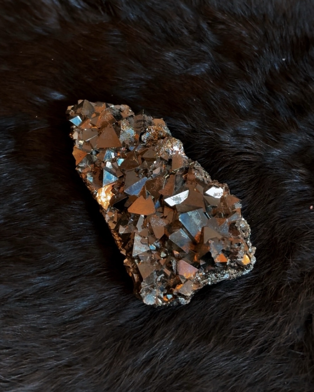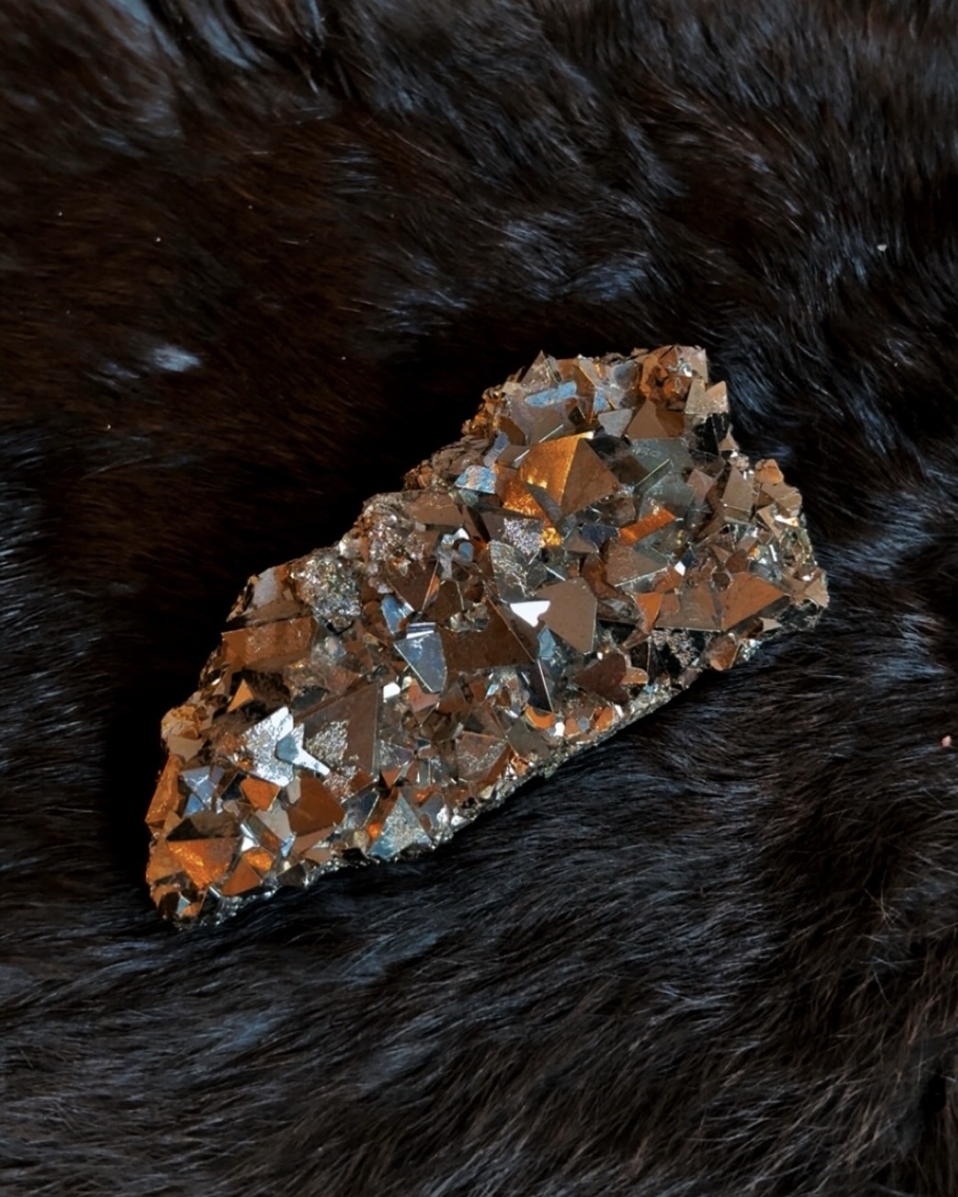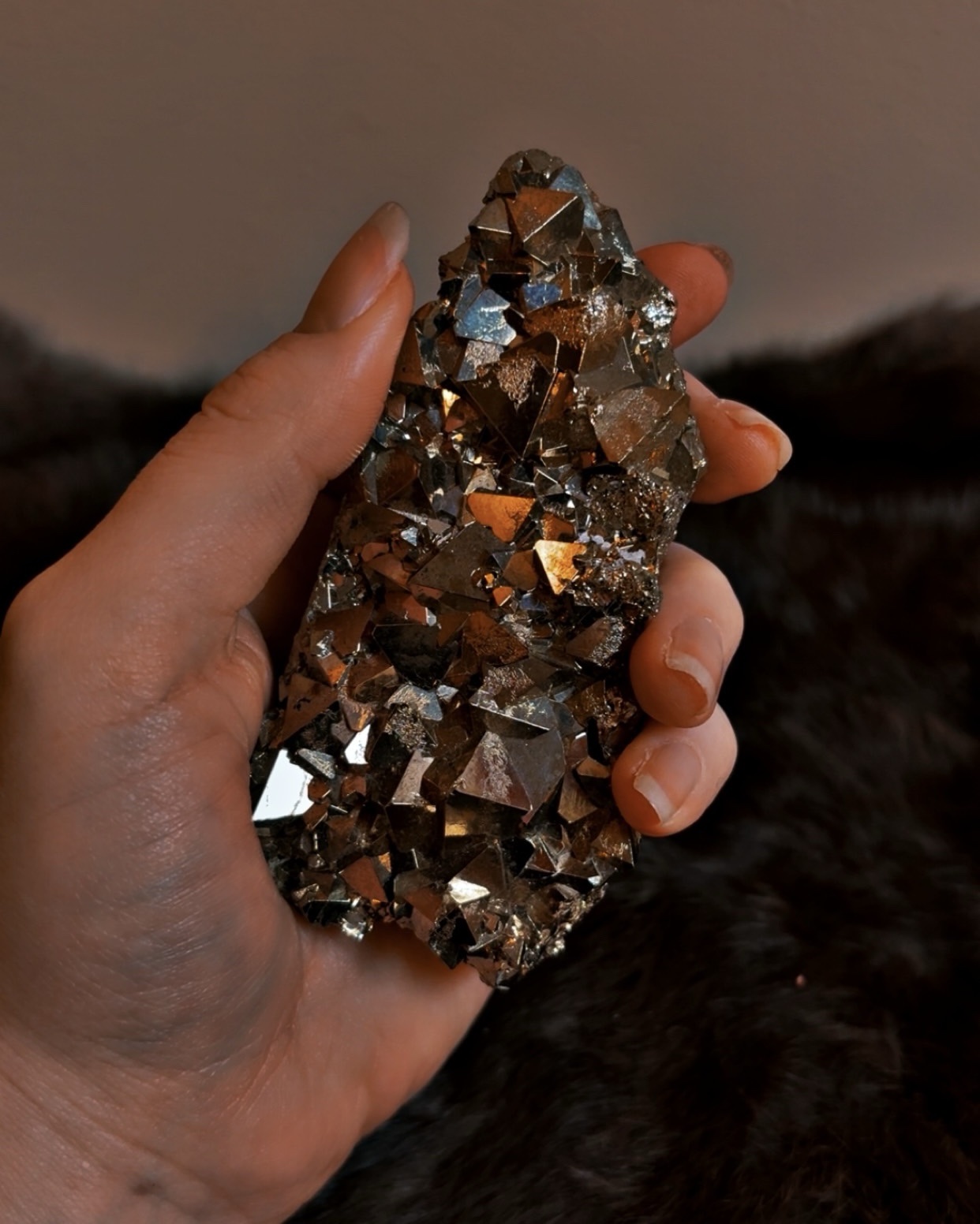 These natural Pyrite clusters are bold, grounding, and unmistakably powerful. Each specimen features sharp geometric crystal formations with a deep metallic luster, ranging from warm gold to darker, smoky bronze tones depending on the light. No two are alike — each carries its own architecture, weight, and energetic presence.