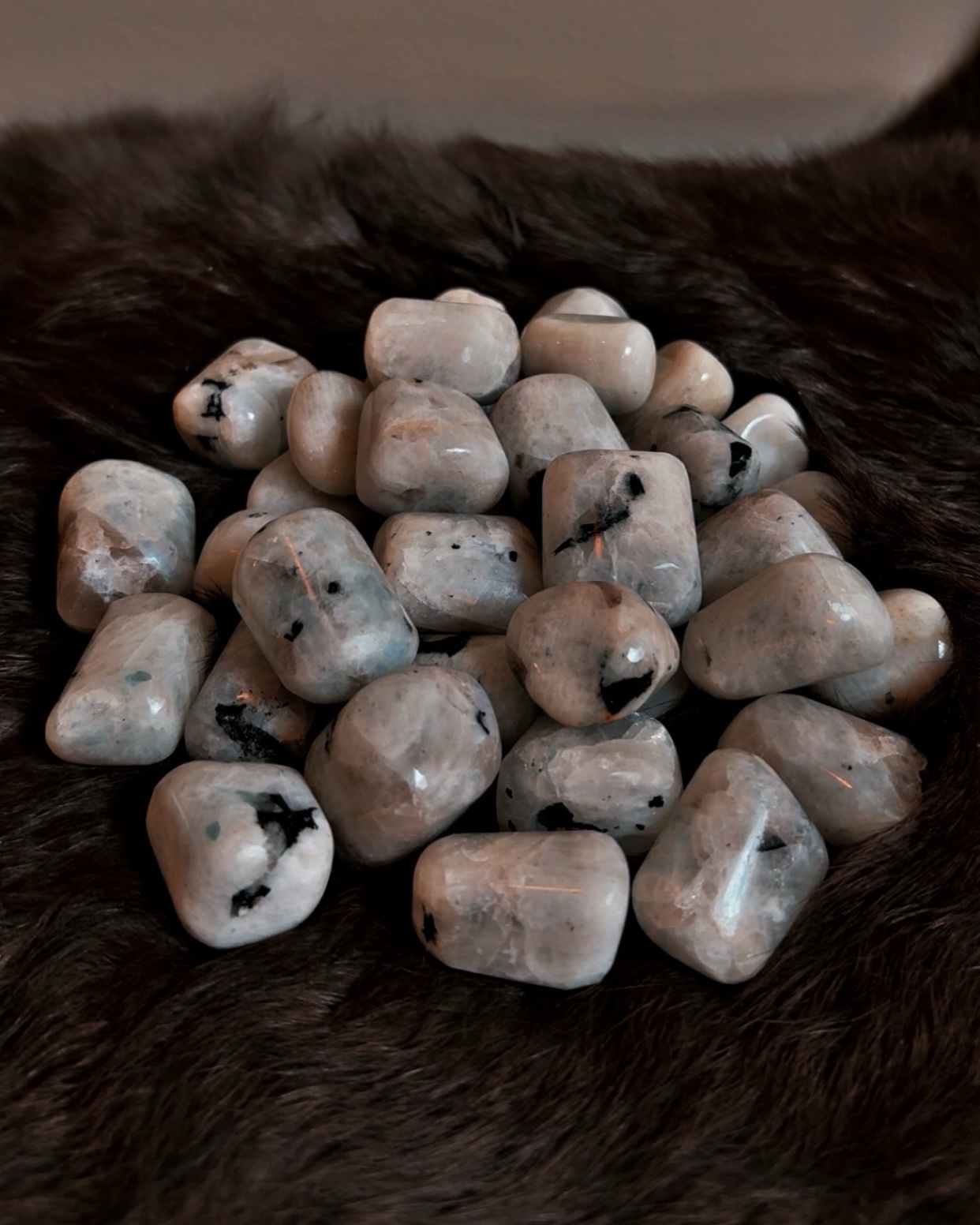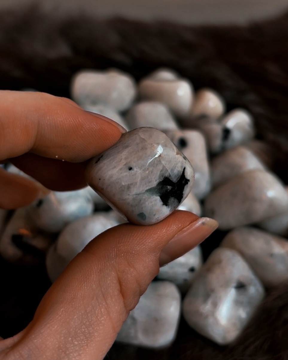These tumbled Rainbow Moonstone stones carry a soft, luminous presence—milky whites and silvery greys accented by flashes of blue, peach, and spectral light that appear when the stone catches just the right angle.