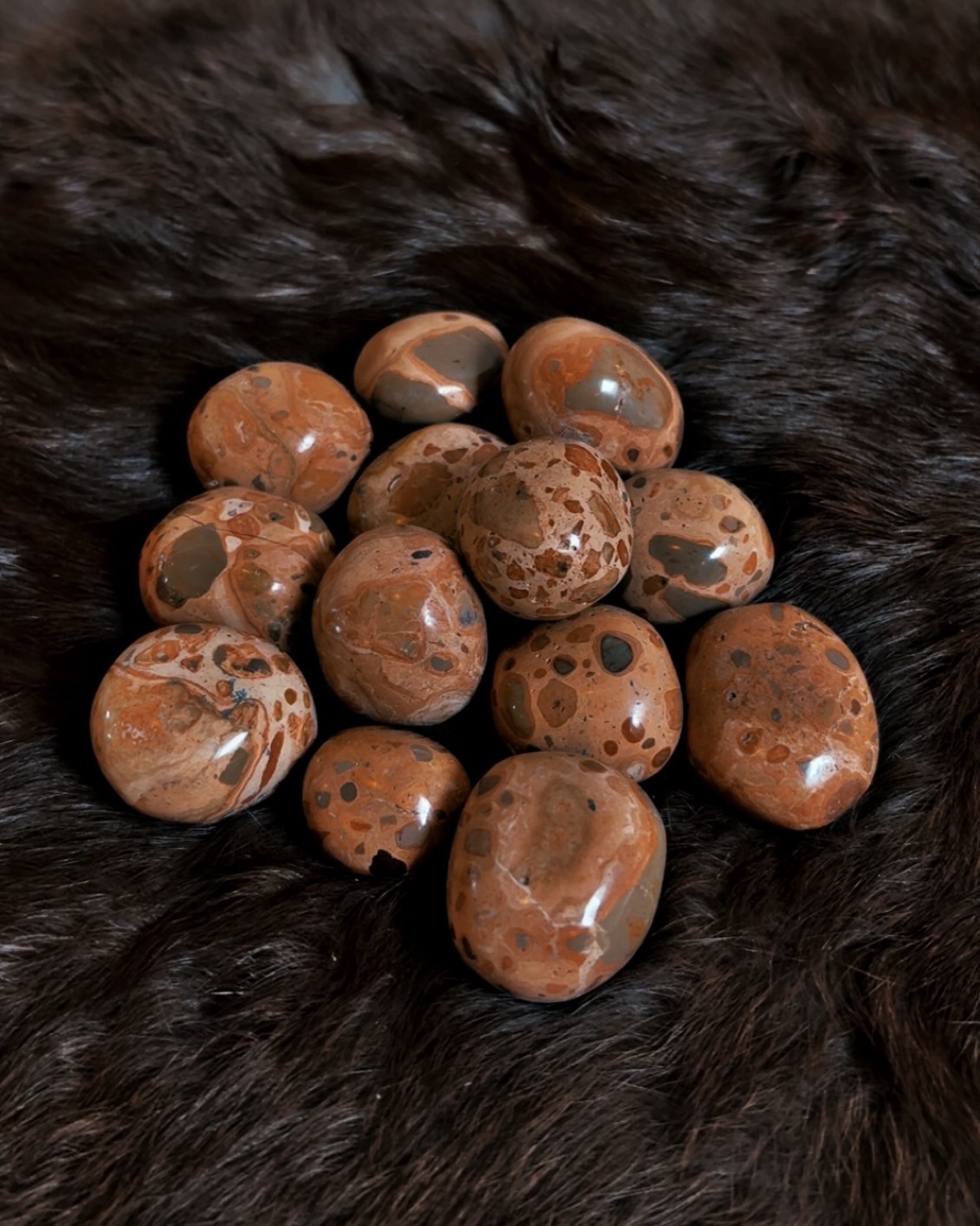 These tumbled Rhyolite stones feature warm earth tones—rust, clay, taupe, and soft olive—scattered with natural orb-like and mottled patterns. Each piece looks almost like a miniature landscape or animal print, which is why this material is often called Leopard Skin Rhyolite in the crystal world.