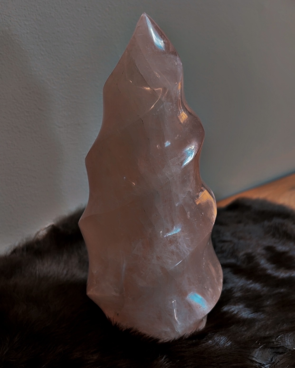 This one-of-a-kind rose quartz flame is a statement piece in every sense of the word. Tall, weighty, and softly luminous, it holds the presence of something ancient and steady: not fragile love, but enduring devotion, self-sovereignty, and emotional truth that has survived initiation.