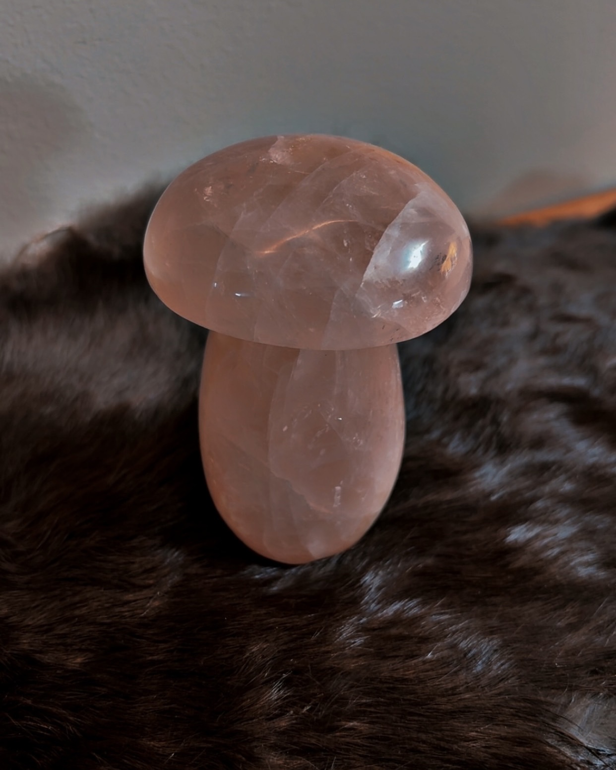 Unlike larger rose quartz forms that anchor or project, this mushroom works subtly. Its energy is intimate and companionable, making it especially well-suited for bedside tables, desks, children-at-heart altars, or spaces where comfort and gentleness are needed.
