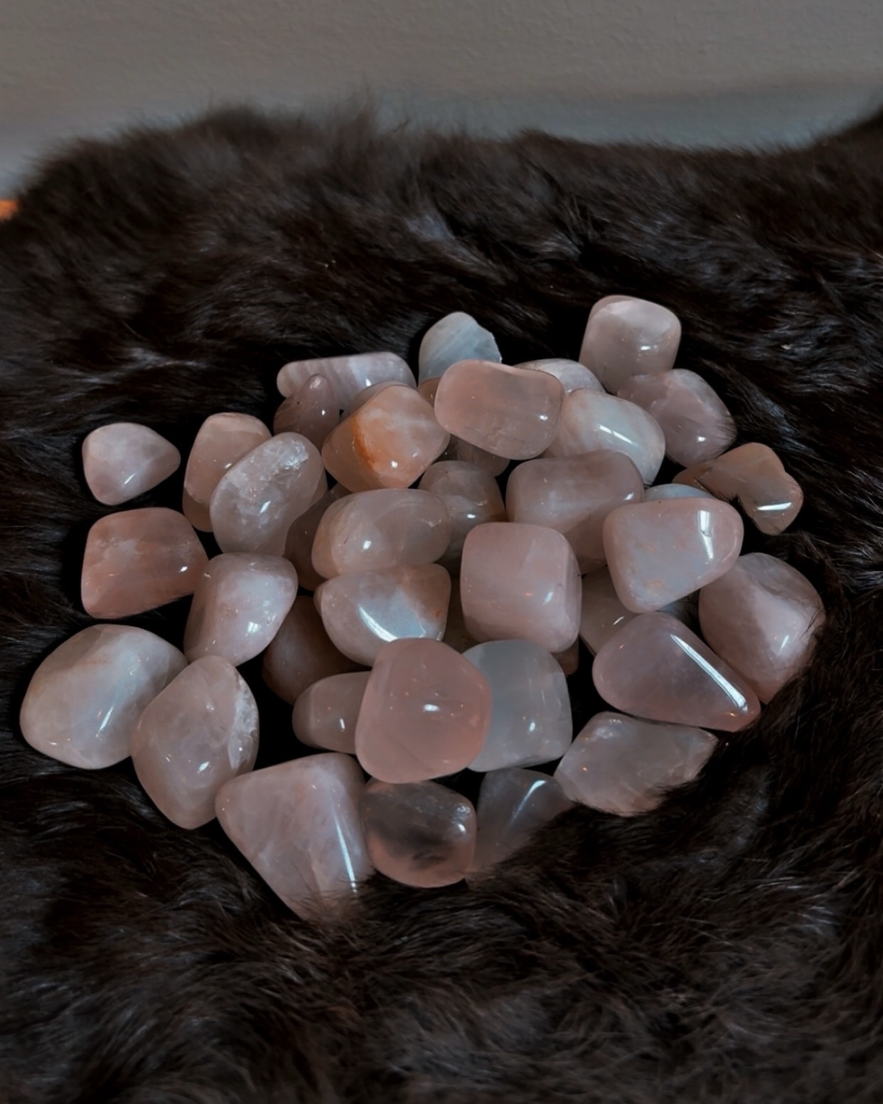 These tumbled Rose Quartz stones carry a soft, nurturing presence—gentle blush pinks with natural clouding and translucence that feel immediately comforting. Smoothly polished and about 1” in size, they’re easy to hold, carry, or place anywhere a touch of tenderness is needed.