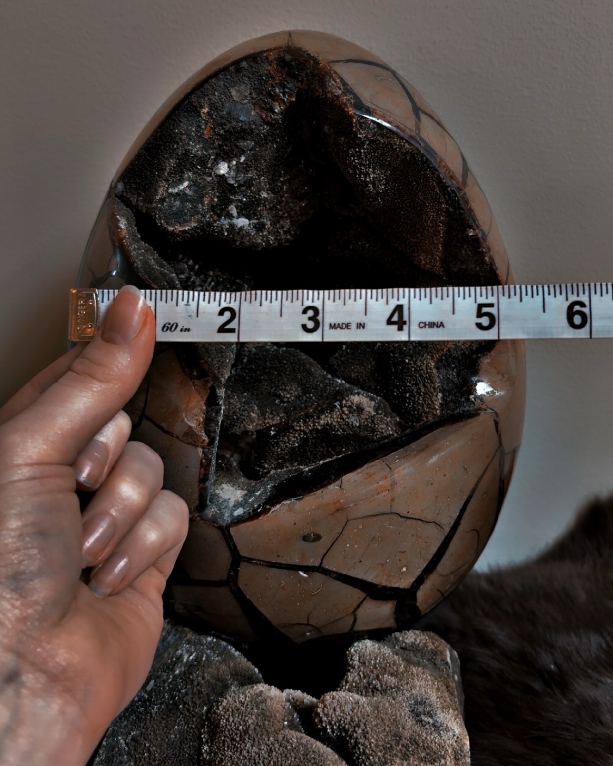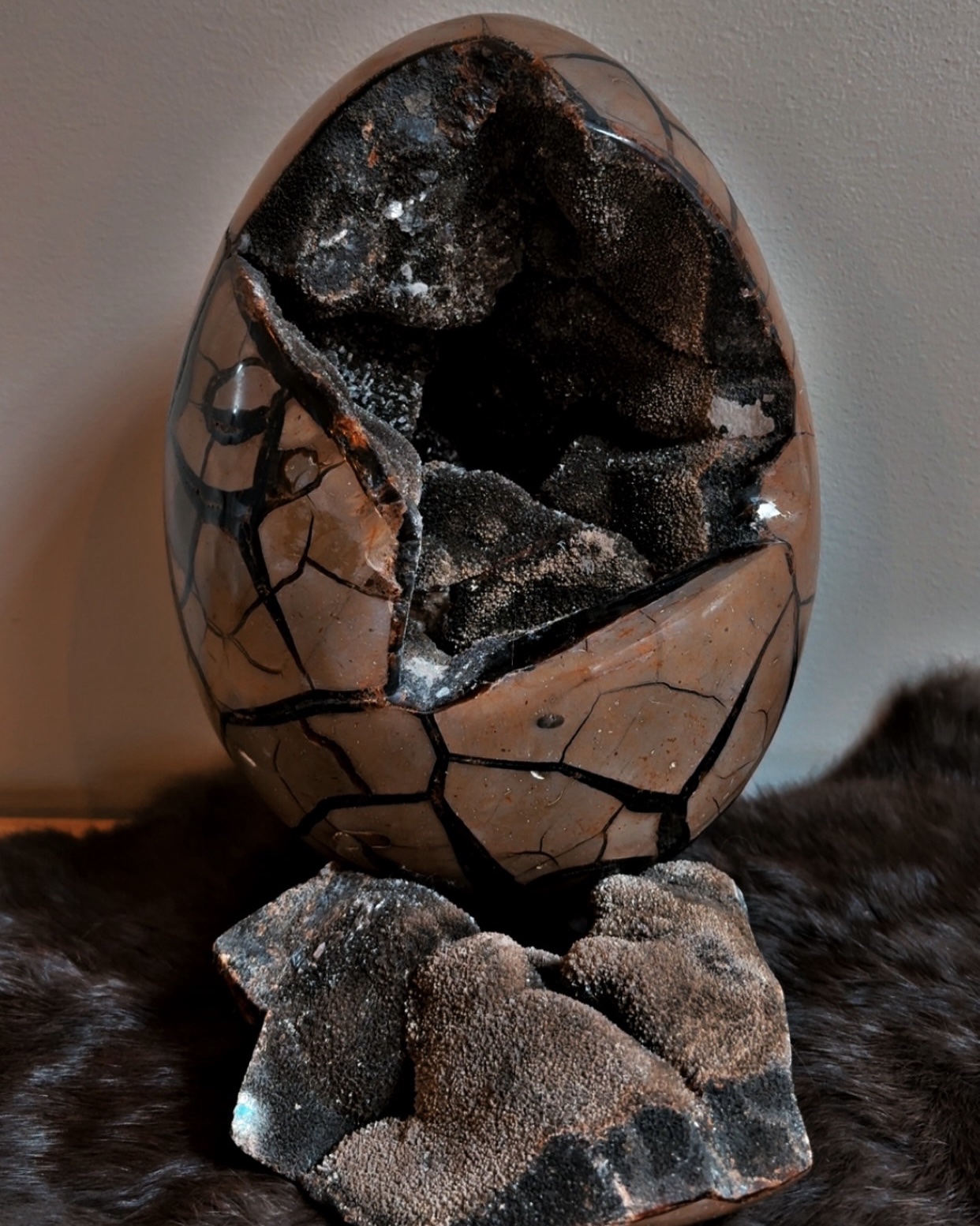 With its removable front section, this egg can be displayed open to reveal its interior or partially closed to emphasize the mystery of what lies within. At over ten inches tall, it functions beautifully as an altar centerpiece, threshold stone, or statement specimen for collectors who prefer a more upright, columnar energy.