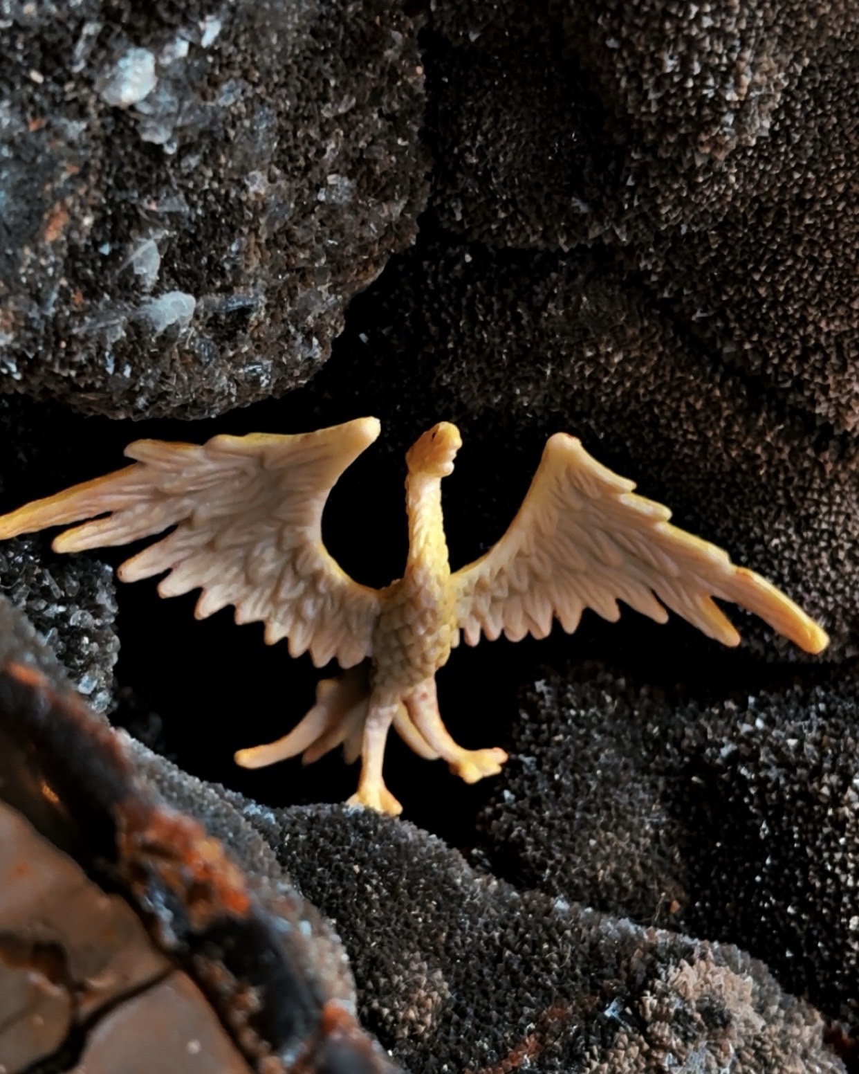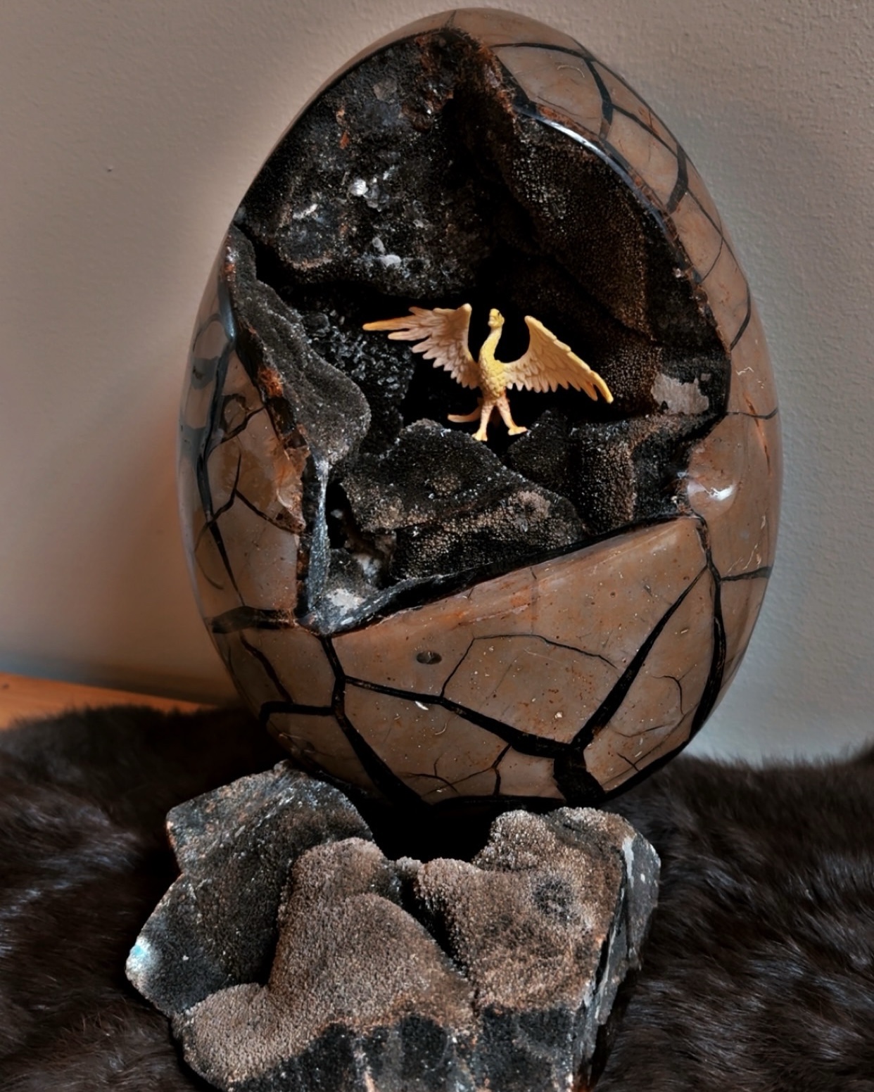 This striking septarian dragon egg features a taller, more elongated profile, giving it a distinctly watchful, guardian-like presence. Though slightly lighter than its companion piece, its vertical form and deep internal cavity make it feel no less commanding.