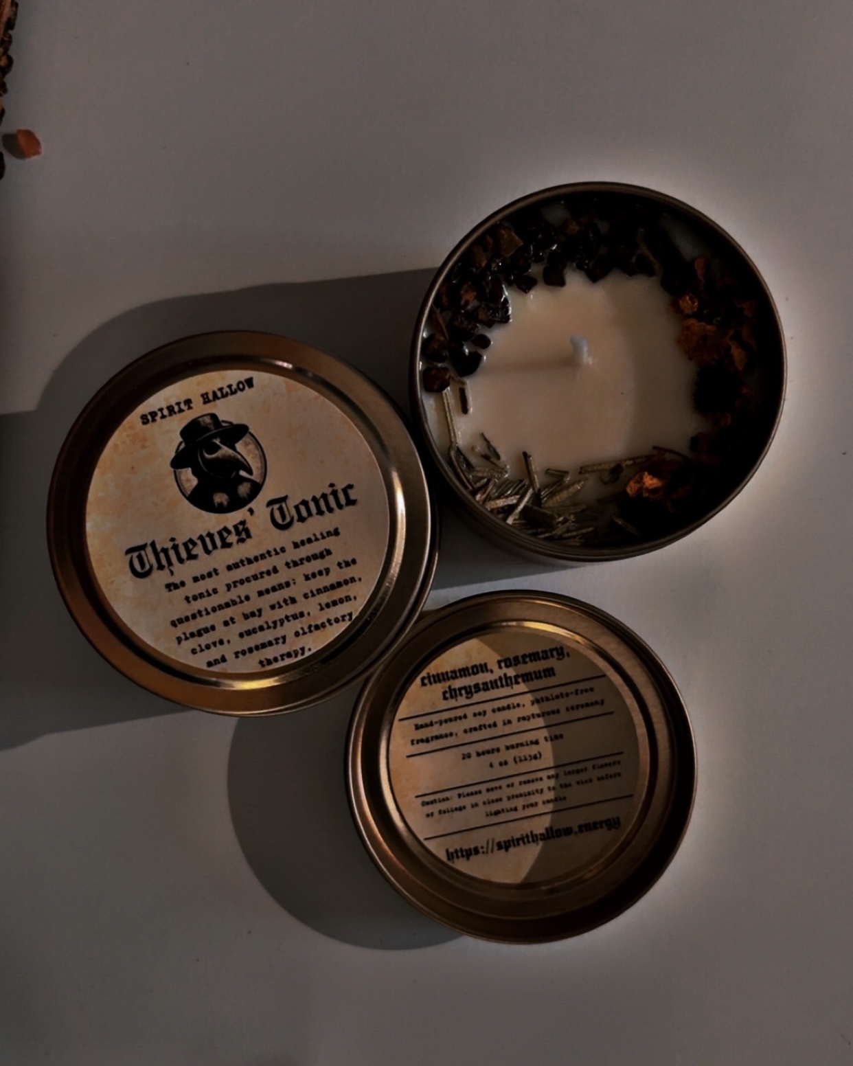 Inspired by the Old World legend of the Five Thieves, this candle braids together cinnamon, clove, eucalyptus, lemon, and rosemary into a bright, aromatic shield. It’s crisp, herbal, and cleansing – like opening the shutters of a witch’s cottage and letting charged sunlight sweep the room.