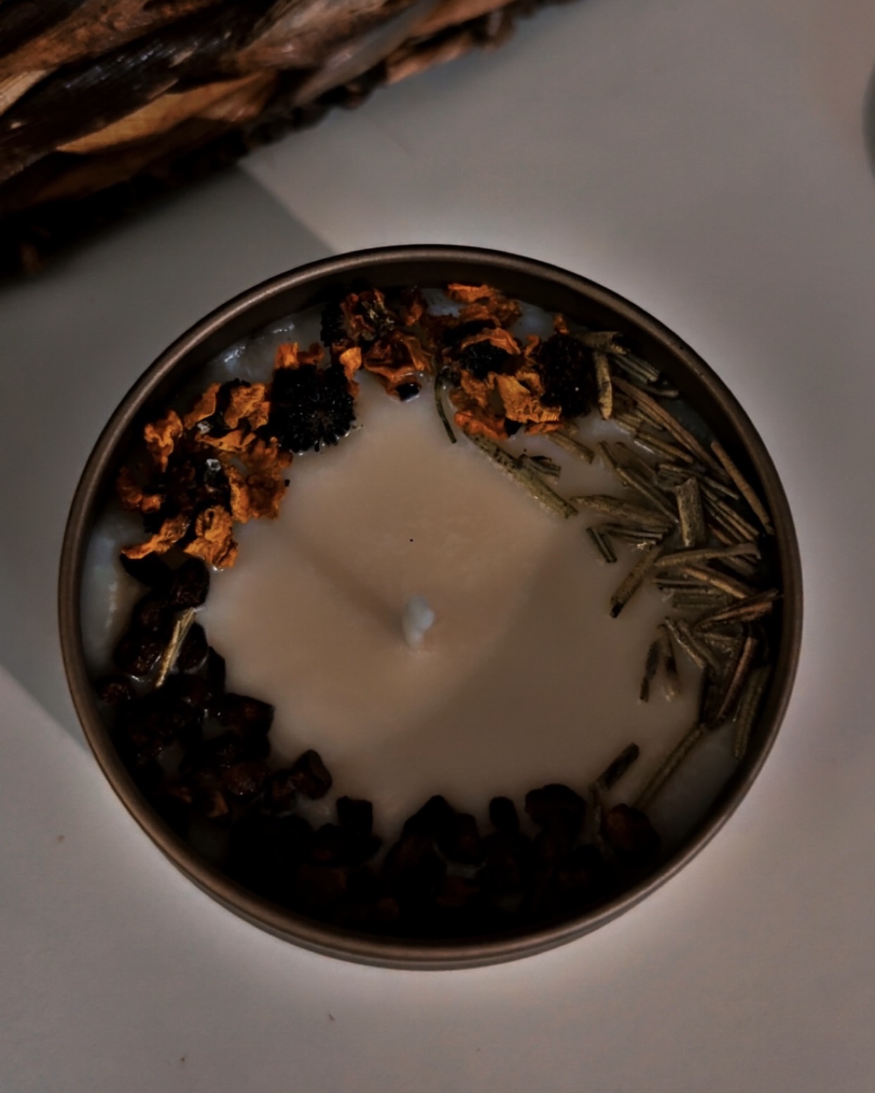 The surface is crowned with dried cinnamon chips, rosemary needles, and snow chrysanthemum blossoms, each chosen for their purification and resilience in folk magic.