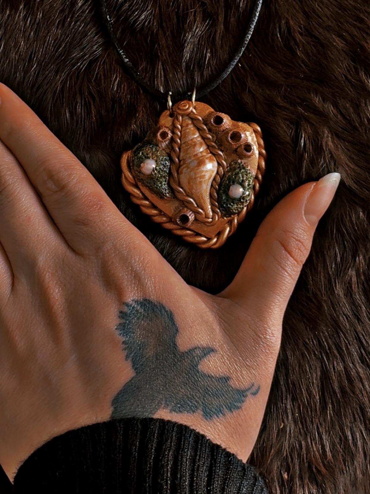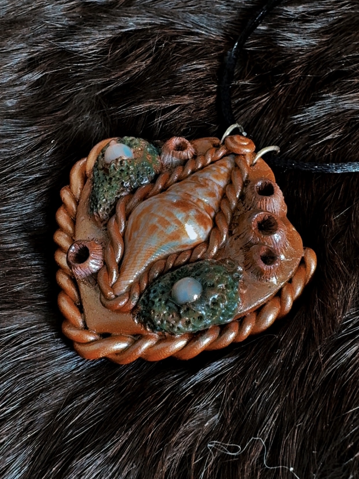 Tidewomb is a handcrafted talisman of oceanic origin and divine emergence — a sacred offering to the sea within. Anchored by a natural spiral shell, framed in braided copper, and adorned with tidepool textures, this 3” x 3” pendant evokes saltwater memory, sensual awakening, and the spiral of creation.